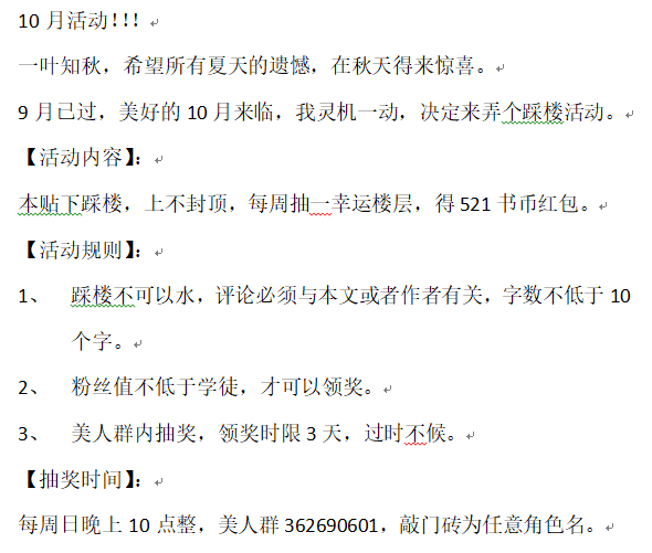 One leaf knows autumn, and I hope all summer regrets will be pleasantly surprised in autumn. . September has passed, and the wonderful October is approaching. I had an idea and decided to have a building stepping activity. [Activity content]: In this post, you can step on the floor below, and there is no limit on the top. You will draw a lucky floor every week and get a red envelope of 521 book coins. [Event Rules]: 1. Don't step on the building. Comments must be related to this article or the author, and the number of words must be no less than 10 words. . 2. Only those whose fan value is no less than that of the apprentice can receive the prize. . 3. There will be a lottery among the beauties. The time limit for claiming the prize is 3 days. No waiting will be done if you are late. . [Lottery Time]: Every Sunday night at 10 o'clock sharp, the beauty crowd is 362690601, knocking on [the door brick is the name of any character.
