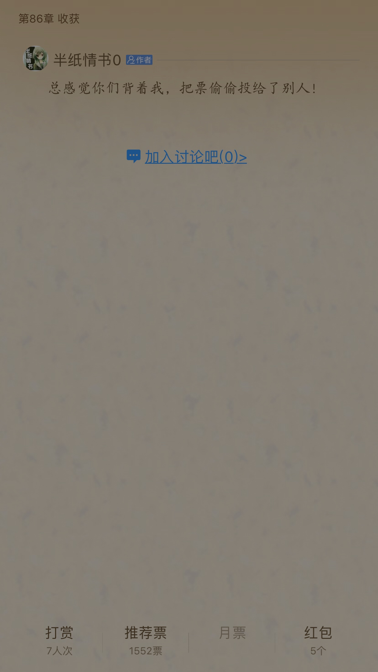 Because I liked the author's last book, I voted for it and later realized that I should vote for the current book There are only two recommendation votes, all thanks to the author^0^~ This is my first review, and I don't know what to say. I just want to say that although I don't particularly like this book, when I have time to read novels, my recommendation vote will definitely go to the author. Ps: Who told my family not to open a bank card for me, and I don't have any money in WeChat red envelopes The only thing I have is recommendation tickets