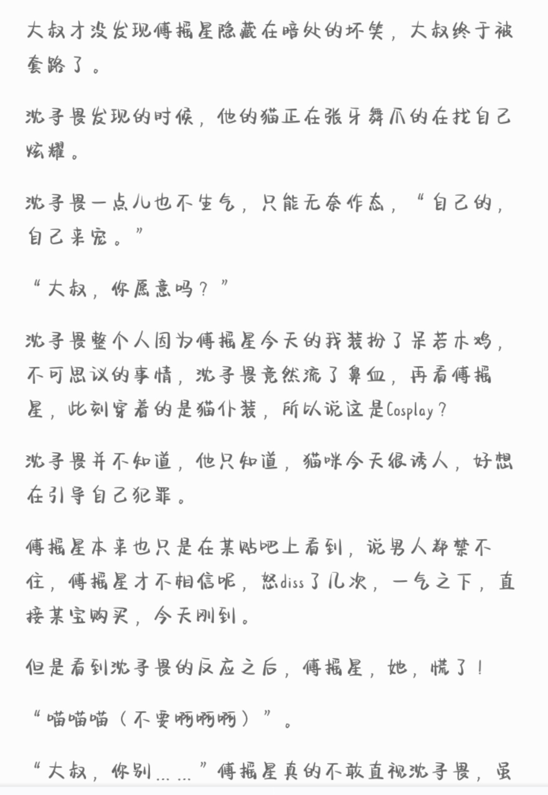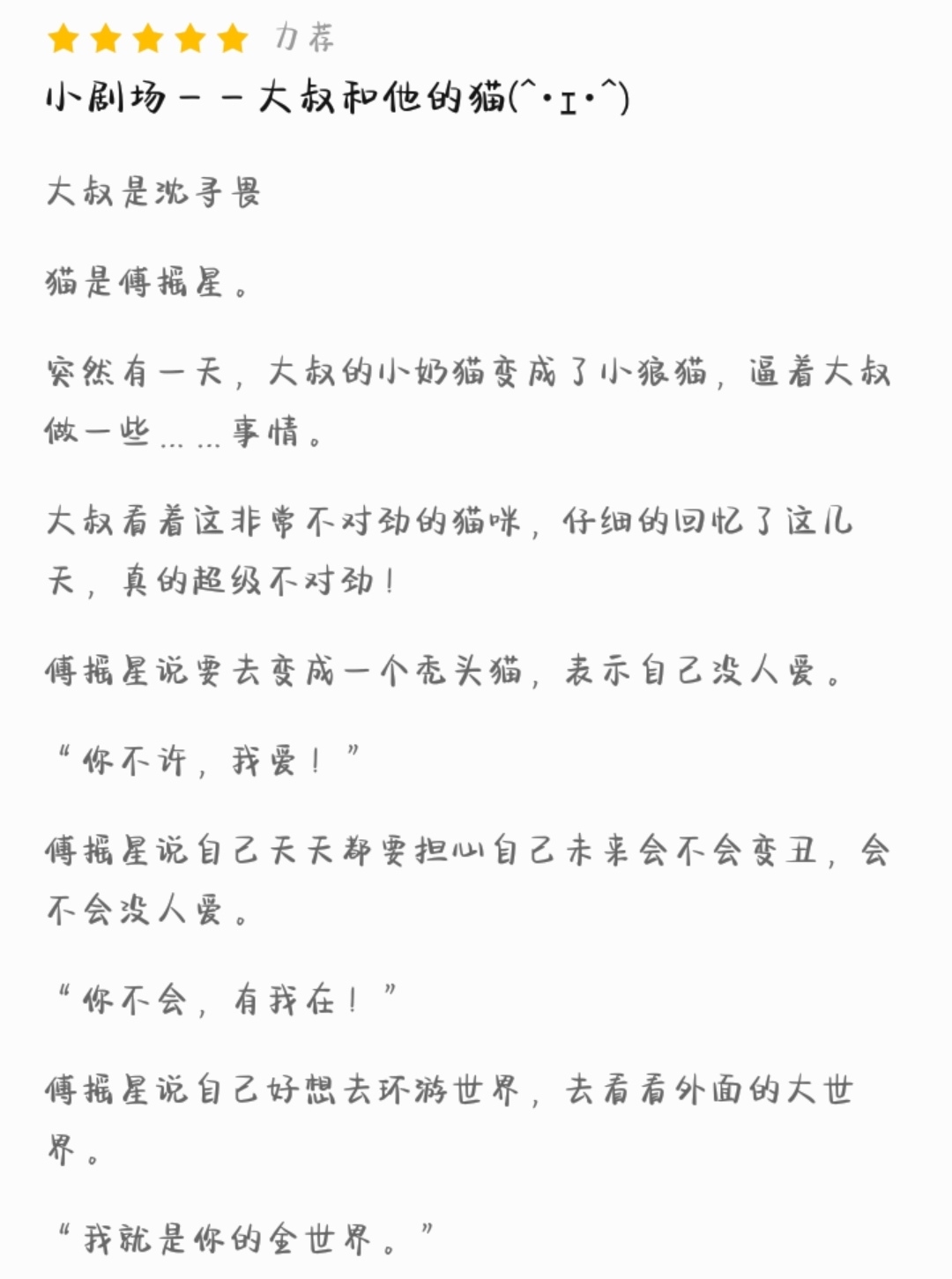 The uncle is Shen Xunwei The cat is Fu Yaoxing. Suddenly one day, the uncle's little milk cat turned into a little wolf cat, forcing the uncle to do some... Things. The uncle looked at this very strange cat and carefully recalled the past few days. Something was really wrong! Fu Yaoxing said he wanted to turn into a bald cat to show that no one loved him. "You don't allow it, I love you!" Fu Yaoxing said that he worries every day whether he will become ugly in the future and whether he will be unloved. "You can't, I'm here!" Fu Yaoxing said that he really wanted to travel around the world and see the big world outside. "I am your world." The uncle didn't notice Fu Yaoxing's evil smile hidden in the dark. The uncle was finally tricked. When Shen Xunwei found out, his cat was showing off to him with all its teeth and claws. Shen Xunwei was not angry at all and could only pretend, "It's yours, you can pamper it yourself." "Uncle, are you willing?"