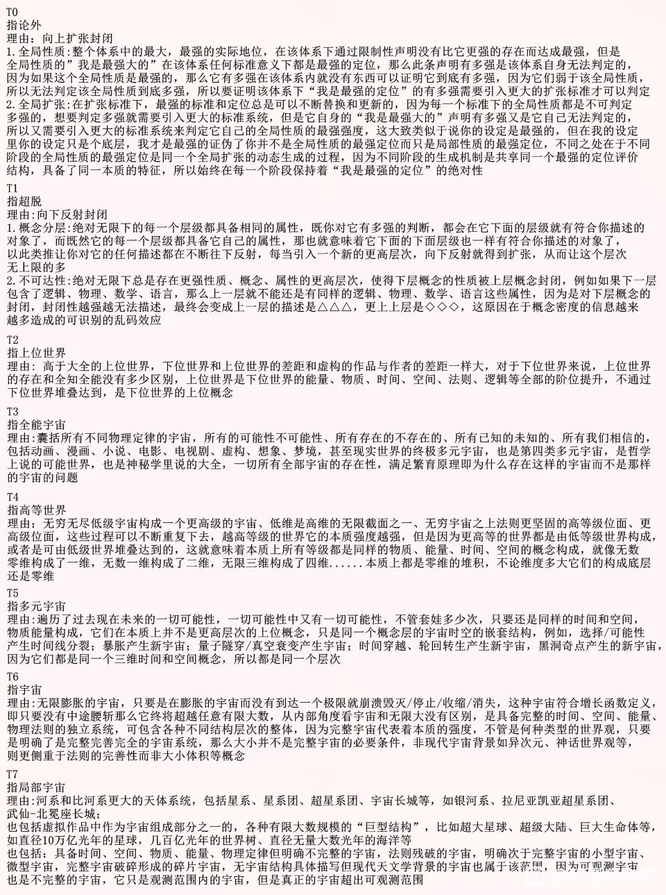 The author's writing is very good, come on ↖(^ω^)↗ and don't stop. The author does not need to follow the Wangba system. The Wangba system has a lot of problems as a single entity and uses set theory and pseudo-infinity indiscriminately. The author can take a look at this setting for reference. T7 refers to the scale of any finite large number starting from the observable universe and including large numbers of the growth rate function. Regardless of the Gregorian number or the tree3 Rayjot number, large garden numbers fall into this range. It is also clear that the universe will collapse itself (such as the heat death tear). This situation falls into this range regardless of the scale. Even if the word infinite appears, it still does not conform to the higher level. Any stacking multiple, no matter how big it is, falls into this category because the concept of infinity cannot be expressed by multiples. Characters at this level can initially control the cause and effect of the timeline to create and destroy the universe, but it will not be a completely free CD type. T6 refers to the complete law universe with infinite existence and infinite energy. No matter how infinite is divided, it is infinite. And the complete universe will never collapse due to its own reasons. The t6 character even involves the self-existence of a perpetual motion machine with no cause and no effect. The infinite energy is created out of nothing (whether it is heat death or the big rip, etc. Will not appear in this type of universe). The ability to delete, create and reshape the universe at will without consumption, no CD permissions, and an unlimited number of them all fall into this category. However, this type of character cannot be completely transcended and unified in all possible timelines of all types of universes. The t5 multiverse contains all possible timelines of all possible types of universes (including but not limited to the physical universe, the magical universe, the fantasy universe... Various types of universes with different underlying rules), and no matter how you stack up all possibilities in all possibilities... Continuous matryoshkas are only inherent in the multiverse. T5 characters need to traverse all the possible timelines of the above multiverse, transcend all possible timelines and cause itself, become the eternal and unique multiverse of all time and space, and the entire worldview is omnipresent, omniscient and omnipotent. In terms of temporal logic, its existence and power are wrong as soon as it is said and wrong as soon as it is thought about. It is a well-deserved ceiling for the worldview without involving meta-levels such as the narrative layer. There is a hierarchical gap at the beginning of the t4 high-dimensional/narrative layer. Seeing everything from the upper level to the lower level is equivalent to fiction and non-existence. For example, cross-work and cross-type themes (such as novels, movies, comics, animations, TV series, etc.) Are all part of the narrative stack in the T4 level. And this process can continue forever. Any stacking of boxes basically falls into this category. Even the concept of "existence/non-existence/non-existence..." Is the same. There can be any number of levels within t4. T3 The largest collection of concepts/categories/worldviews, etc., Including all dualities, including everything, everything, not everything, not everything, not everything, not everything, not everything, not everything... Known, unknown, not unknown, not non-known, unknown, super unknown, possible, impossible, non-impossible, super "possible/impossible", exists, does not exist, does not exist, does not exist, does not exist, does not exist, does not exist, does not exist, does not exist, does not exist, does not exist, does not exist, does not exist... Will expand endlessly. Definable Undefinable Non... Not "definable/undefinable" Descriptible Undescriptable Non... Not "descriptable/undescriptable"... Not everything and everything outside the category Super category Non-category Non-non category... This kind of infinite expansion continues. Whenever a new concept is proposed, this new concept has its binary relationship, and can forever expand the essence of the ultimate category. Or if it embodies and includes all the concepts that constantly emphasize the outside, it does not exist, or if there is an outside, it is not the real t3. T2 The absolute concept itself that completely transcends the dualistic framework. Even if a new conceptual dualistic framework is invented, the same is true. The duality of strong and weak has lost its meaning for it. For example, true omniscience and omnipotence can completely transcend the existence that is forcibly greater than it at will. Beyond everything, beyond existence itself, it can only define itself by itself. Only itself can measure and define it. "I am the absolute itself, and my thinking is existence." Any judgment on t1 will never be true, even if it is described by transcendence, absolute negativity, and the infinite escape description at the level of the setting itself can never tell its true strength. For example, if you say it "can never be defined by any conceptual description," it is already there at the bottom of t1; my comment just now that "the bottom level of t1 is beyond any conceptual definition and description" itself is also present at the lower level of t1... This process will never end in the setting itself. This structure can only be embodied step by step in a preset way. Any boastful description cannot achieve t1 and can only be barely presented in the form of infinite negation. The core is the objectively real ineffability. T0 is stronger without reason, and requires that its nature of power cannot be explained by any source of reason. It is just that action is greater than explanation. Even if it is directly reflected in the setting "because it is completely unreasonable and does not need a reason to be s