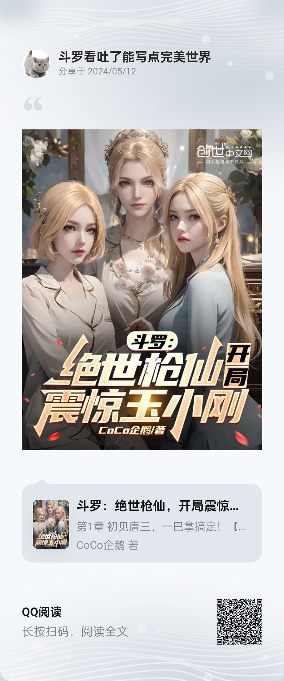 New book: "Douluo: I am the Wine and Sword Immortal, and I shocked Ning Rongrong at the beginning" Chu Yuan accidentally traveled to the world of Douluo Continent and awakened the god-level martial spirit Silver Dragon Demon Spear. Chu Yuan, whose parents died when he was young, came to Shrek Academy in Soto City by chance. Because of his outstanding talent and extremely fast training speed, he was admitted to the academy by Flanders, the president of Shrek Academy. During this period, his performance was outstanding and his talent was extremely high. Dean Flender and Vice Dean Zhao Wuji unanimously decided to appoint Chu Yuan as a teacher at Shrek Academy. In this life, Chu Yuan walked on thin ice, paying no attention to the world and focusing on cultivation. Five years passed in a blink of an eye. On that day, Chu Yuan sat on the silver dragon and decided to return to the academy, only to find that the original Shrek Academy had recruited several more disciples. Tang San: "Article 3 of the Xuantian Treasure Record, you have a way to die!" Master: "Xiao San, I apologize to Chu Yuan!" Bibi Dong: It seems that the youngest titled Douluo in Douluo Continent is about to change hands.