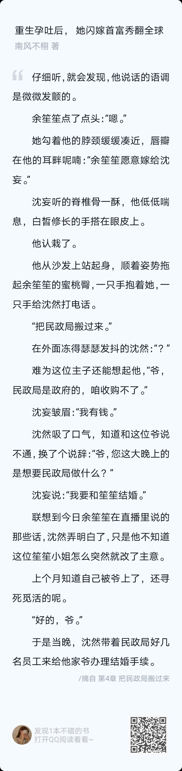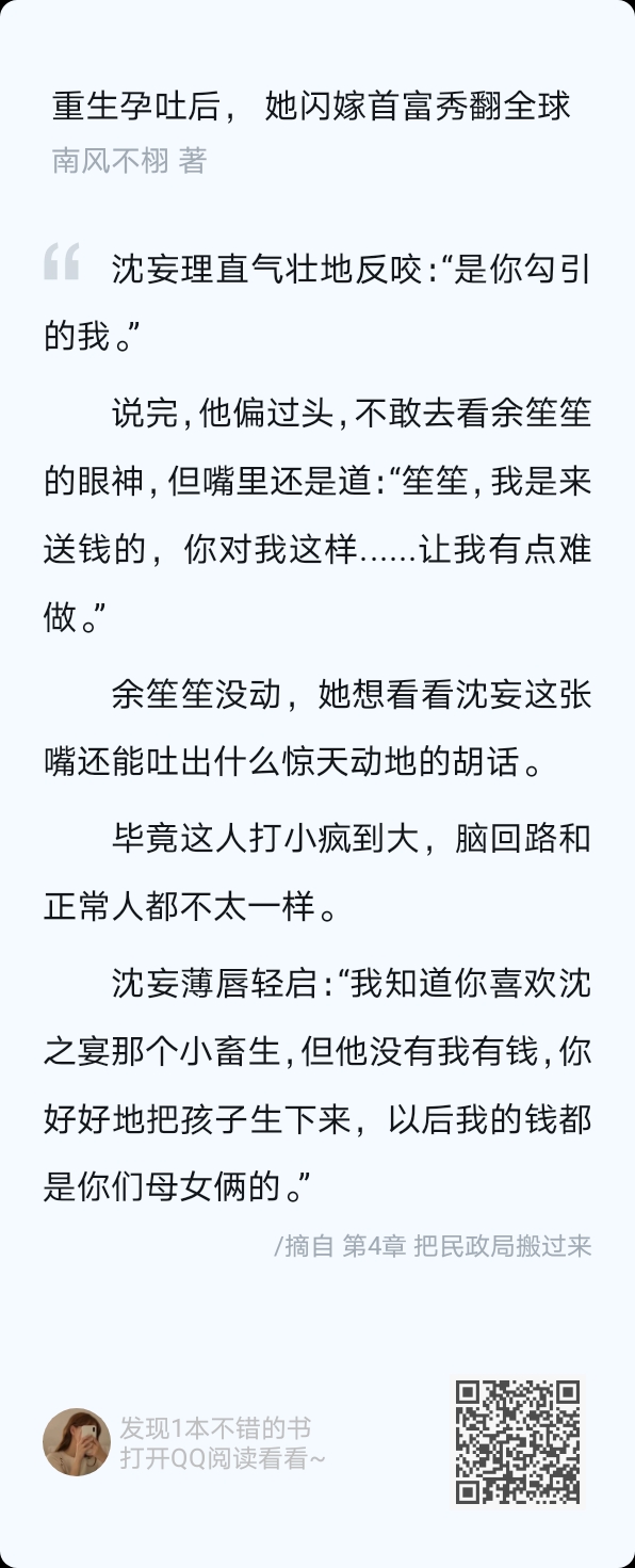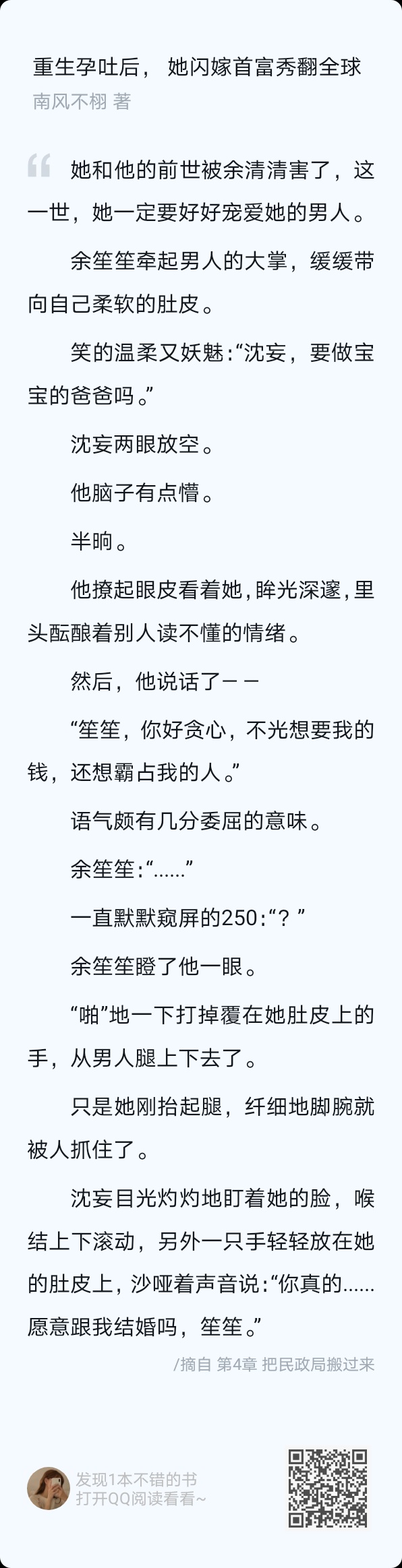 This book gave me the feeling that our brother Wang has some yandere constitution. This kind of yandere is different from the real yandere. He is just sick, and the only medicine that can cure it is Shengsheng. I also hope that Shengsheng can find the cause of his illness as soon as possible and help him relieve his heartache. We will not be afraid of Brother Wang's illness. All kinds of behaviors make people feel distressed and worry that something will happen to him. The only thing he will not do is hurt us Shengsheng. I hope the knot in my heart can be cleared up, and the baby will probably move by then. It's so warm for a family of three (。・ω・。). By the way, although I have received the certificate, there is no wedding yet. I saw how cautious Brother Wang was before, please Shengsheng, please announce it to the whole world quickly and give me a name! ! Look at the poor child. You can also wait until you get to know your mother, and everything will get off to a good start. At this time, the proposal and wedding will come naturally. The fate of two people, maybe it just comes a little late. Let's look forward to what follows (✪▽✪)