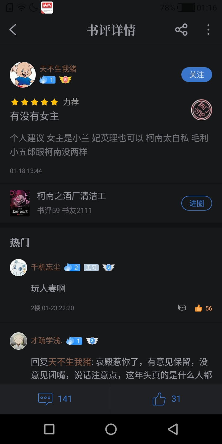 I can handle the poison points, and my reading level is below mine. One star The brain level is higher than the standard line of Conan of the same type. One star The story, logic, and overall writing are better. One star The heroine looks like Ai Jiang. Half star There are the same problems as the Conan timeline, but it does not affect reading. Half star