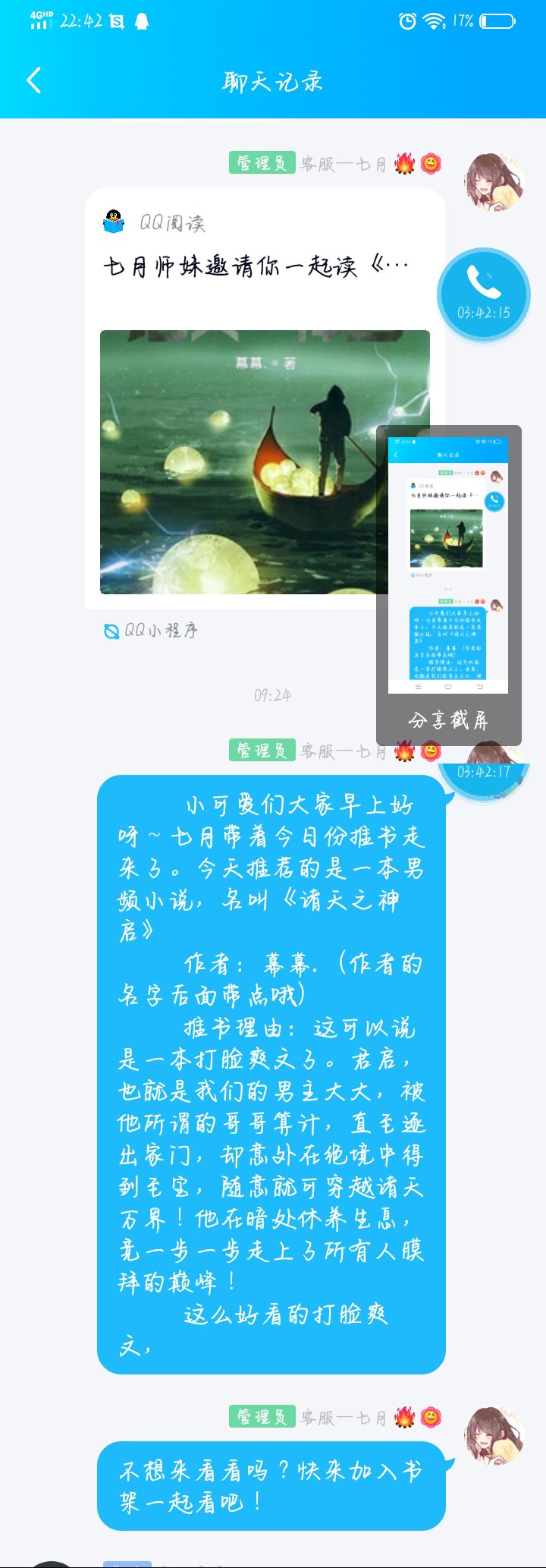 Requirements: 15 consecutive days of perfect attendance are required to participate. Participate in the Q lottery with 15 screenshots, The first prize is a set of Chinese Hanfu (guaranteed to be authentic, but very poor, after all, poor) Second prize 5.2 Red envelopes Third prize 0.52 Yuan Rush, rush, rush (If a boy wins the lottery, it would be a good idea to give it to his girlfriend) (The new book is not popular. If only one person participates, the first prize will be awarded by default) Draw date: 4.30