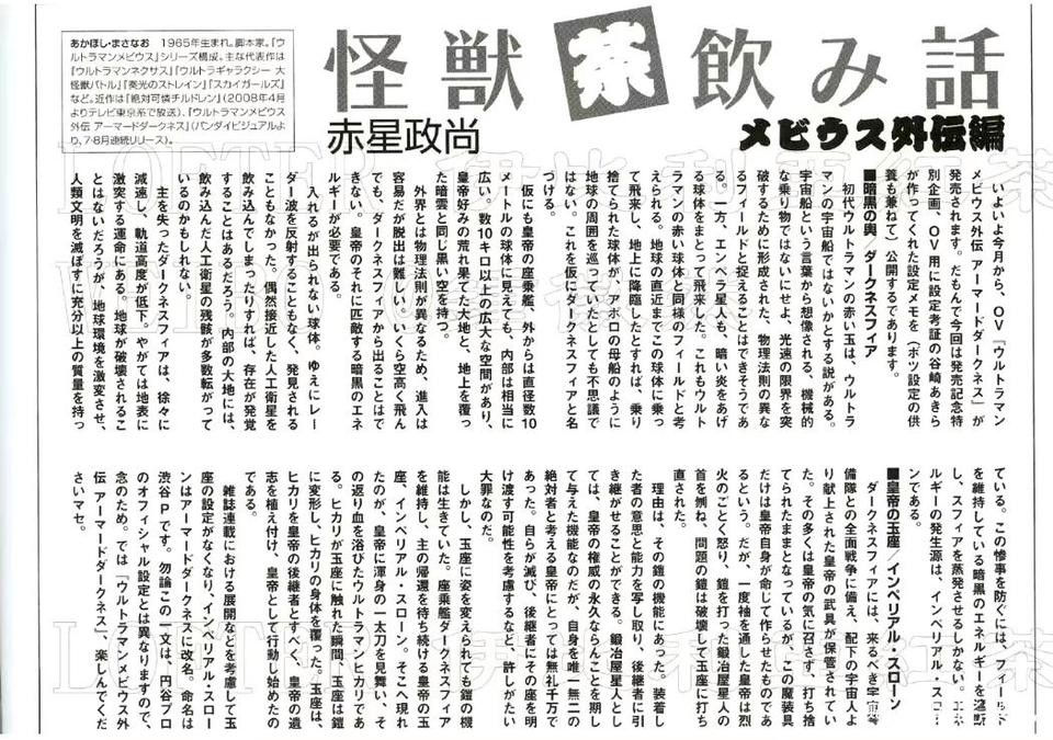Strange beast drinks the words The Story of Mebius Akahoshi Masanao Finally, starting this month, the OV "Ultraman Membius Gaiden: Dark Armor" will be released. Therefore, this time as a special project to commemorate the release, the setting memorandum created for OV by setting reviewer Ryo Tanizaki will be released (it also doubles as a burial of abandoned settings). ■ Dark Realm There is a theory that the red sphere of the first Ultraman may be Ultraman's spaceship. It is not the mechanical vehicle that the word "spaceship" brings to mind, but can be understood as a field with different physical laws that was formed to break the limit of the speed of light. On the other hand, the Ampera aliens also flew in wrapped in spheres emitting dark flames. It can be considered that this is the same realm as Ultraman's red sphere. If he came near the earth in this sphere and then descended to the surface, it is not surprising that the abandoned sphere lingered around the earth like the mother ship of the Arbois. Let's temporarily name it "Dark Realm". After all, this is the emperor's own ship. Even though it is a sphere with a diameter of tens of meters from the outside, it is quite vast inside. There is a huge space of more than tens of kilometers. Inside is the desolate land that the emperor likes. The sky is the same black as the dark clouds covering the ground. Because it is different from the physical laws of the outside world, it is easy to enter, but difficult to escape. No matter how high you fly, you cannot leave the dark realm. It requires dark energy that can rival the Emperor. This is a sphere that can be entered but cannot be exited. Therefore, it does not reflect Rayleigh waves and has never been detected. If by chance an approaching artificial satellite is swallowed up by it, its existence may be exposed. The ground inside may be scattered with a large number of swallowed satellite debris. The dark realm that lost its master gradually slowed down and its orbital height decreased. Will eventually fall to the ground. Although the earth itself will probably not be destroyed, it has a huge mass that is enough to drastically change the earth's environment and destroy human civilization. Imperial throne In the dark realm, there are weapons donated to the emperor by his cosmonauts in preparation for the upcoming all-out war with the Space Guard. Most of them were discarded because they were not to the emperor's liking, but it is said that this set of magic equipment was the only one ordered by the emperor himself. However, after the emperor tried it on once, he became furious and had the blacksmith who made the armor beheaded. He destroyed the controversial armor and recast it into the Amyrlin. The reason lies in the functionality of the armor. It can copy the wearer's will and ability and let the successor inherit it. For the Blacksmith Stars, this was an additional function in the hope that the emperor's authority would last forever, but for the emperor who regarded himself as the unique and absolute one, it was disrespectful. In other words, it is an unforgivable sin to consider the possibility that one may perish and need to give up the throne to a successor. However, even if it is transformed into the Amyrlin, the function of the armor still exists. This is the Emperor's Throne - the "Emperor's Throne" - that maintains the dark realm of the ship and continues to wait for its master's return. And what appeared there was none other than Ultraman Hikari, who had given the emperor a powerful blow and bathed in the blood splashed back from him. The moment Shikari touched the Amyrlin, the Amyrlin (the armor function) was activated. The moment Hikari touched the Amyrlin...