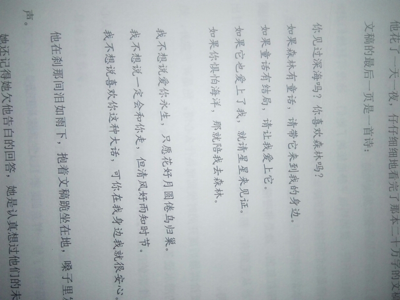 This is a really good book. I read it in one night. Every word in it is very beautiful, telling the love of three people. History is always surprisingly similar, but Xia Shiyu failed to wait for Gong Xu's answer, but Mu Simonan did. The story is very tearful. I think I will never forget "If you can't go to the deep sea -" as he walked out of the office building, Musinan suddenly whispered, "Then go to the forest with me." A person's liking can make him replace the dream of the person he likes with his own dream. This is the case for Xia Shiyu and the same is true for Mu Simonan. I like Mu Simonan very much, a very gentle boy. He did not scold her because his good friend "died" because of Xia Shiyu. He knew that the real reason did not lie with her. He protected Xia Shiyu in his own way. Dr. Zhang said something that touched me very much. I can't remember the details: "You are such a bad girl. If you die like this, what will those people who hate you and those who love you do?" It seems to be what he said. People need a sustenance to live. Xia Shiyu lost her sustenance when Gong Xu died. She was scolded by Shang Gong's family and condemned by everyone. She suffered from mental illness, which was both expected and unexpected. In fact, it wasn't her who was really wrong, but she couldn't forgive herself. You can never wake up someone who is pretending to be asleep. The appearance of Mu Sinan gave Xia Shiyu hope for survival, and she began to look forward to her future. Her death was an accident, but not an accident. I think if she had not died, if she had fulfilled Gong Xu's dream, then she would have been with Mu Simonan. She was looking for a reason for herself, a reason to live. She has decided to forgive herself, but why, why is fate always like this? Finally she left and went to be with Gong Xu. God did not want her to suffer in the mortal world, so he let her go to heaven. But Musinan was left alone in the world. The story is very short and ends right at the beginning. The story seems to be over, but it gives people infinite reverie. I think Xia Shiyu should live a good life in heaven, where there is no disease, no verbal abuse, and there is a boy she loves. The most miserable person in the story is probably Mu Sinan. From the beginning to the end, he is alone, but when he waits for the answer, he is separated forever. He wanted to take her to see the forest he loved, but she was addicted to the deep sea, so he put down the forest and accompanied her to the deep sea, but she died in the sea in the end. Gong Yu is also a poor person. Like Xia Shiyu, the person he loved the most died. Gong Yu is better than Xia Shiyu, but not better than her. They are in love. When the person Gong Yu likes dies, he will suffer even more. But no one condemned him, he chose to escape. But Xia Shiyu is different. Not only does she have to accept the condemnation of others, she also doesn't let herself go. They both have their own differences, but both share the same sadness. "What's wrong with her? She just likes Xiaoxu, just likes one person, but what happened to her? She encountered the condemnation of the whole world, and the cruelest accusations and abuses from the family of the person she liked. Do you understand? Only people with soft hearts will be hurt. She likes Gong Xu, so she was hurt by you." Gong Yu, as a bystander, clearly saw the cause and effect, "Do you know why Si Nan is so angry?" "She suffered from bipolar disorder because of the hatred you had nowhere to place and imposed on her. This kind of disease will never get better in her life. Even if she recovers briefly and is stimulated, she will still relapse." When he said this, he did not have any emotion, he was simply stating the facts, "People who suffer from this disease are sometimes so depressed that they want to die, sometimes they are so excited that they cannot sleep for days and nights. They will be particularly irritable, or particularly depressed... Or even..." This passage left a deep impression on me. Xia Shiyu really did nothing wrong. She just liked someone just because they went diving together. Gong Xu left but she didn't leave. So does she have to accept the condemnation of the whole world? Maybe sometimes death is also a kind of relief, at least for Xia Shiyu at that time. The dead have no future, and the living do not deserve a future. In the final analysis, it was just Xia Shiyu who couldn't forgive herself, but this was also because of other people's condemnation and her own character. Xia Shiyu is really a very beautiful person. She blames herself and feels sad because the person she likes died for her indirectly, or in other words, it has nothing to do with her but left when she was with her. Have you ever seen the deep sea? Do you like forests? If there is a fairy tale in the forest, please bring it to me. If fairy tales have an ending, please let me fall in love with it. If it falls in love with me too, let the stars bear witness. If you are afraid of the ocean, then come with me to the forest. I don't want to say that I love you forever, I just want the flowers to bloom and the moon to be full and the tired birds to return to their nests. I don't want to say that I will definitely leave with you, but the gentle breeze and good rain know the season. I don't want to say such big words that I like you, but I feel at ease when you are by my side.