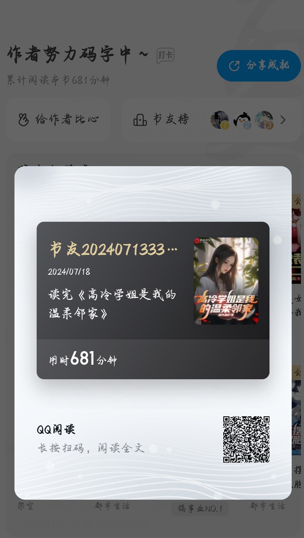 I really like this book by the author. The characters are vivid and not pretentious. The plot is relatively peaceful and has a warm and healing feeling. Some people may prefer more ups and downs and the characters are more sickly. But in fact, I think the plot depicted by the author is the most relevant to life and the most resonant (of course it may be because of my personal preference, this is my subjective feeling) What's a bit sad is that I feel I haven't read enough QAQ. I hope the author can write some longer novels with similar themes. I strongly support it! (PS: If it is convenient for the author, can you reveal some social media contact information to facilitate communication and discussion... QQ group, Weibo, etc.^_ _^)