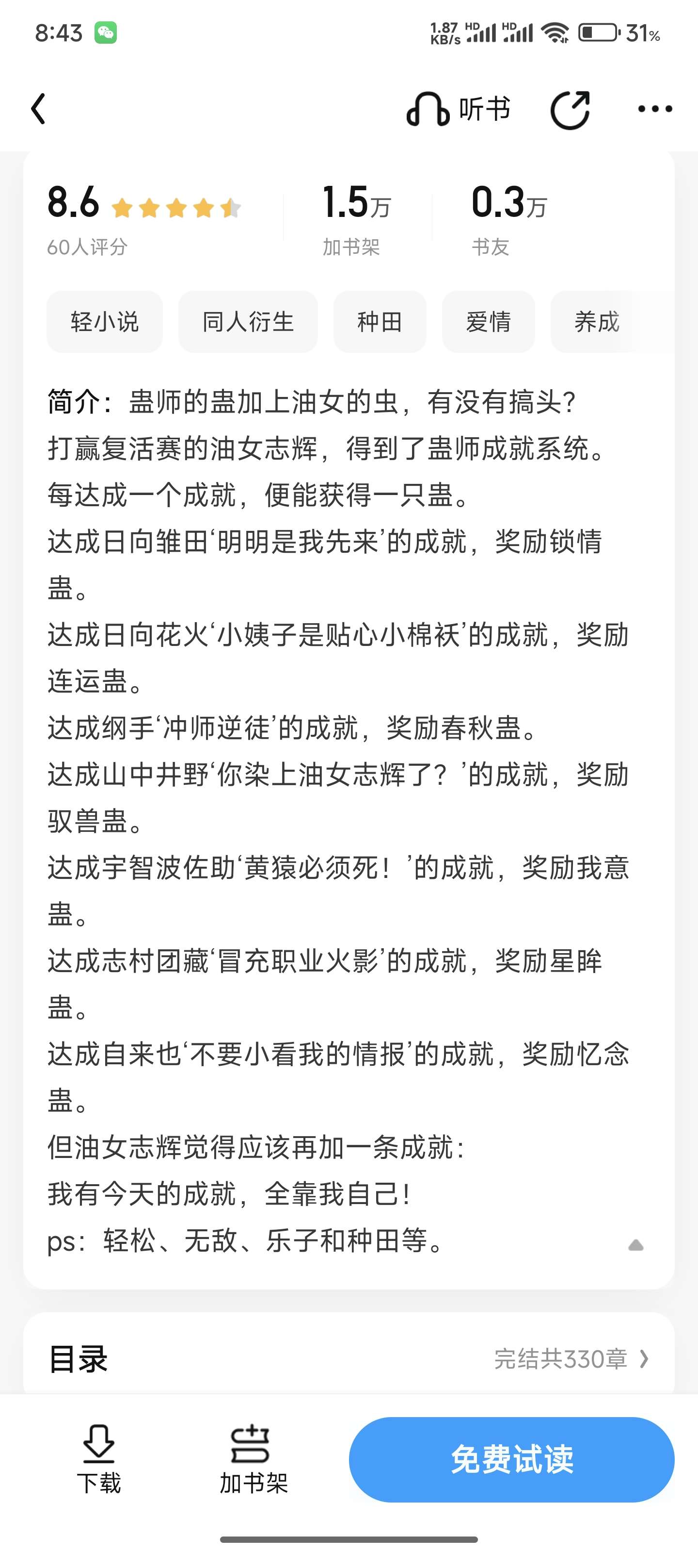 Did the Gu Master's Gu plus the Oil Girl's worm cause a problem? Zhihui Aburame, who won the resurrection match, received the Gu Master Achievement System. Every time you achieve an achievement, you will get a Gu. Achieving Hinata Hinata's achievement of "Obviously I came first" will reward you with the Love Lock Gu. Achieving Hinata Hanabi's achievement of "My sister-in-law is a caring little cotton-padded jacket" will reward you with the Luck Gu. Achieving Tsunade's achievement of "Charging Master and Rebellious Disciple" will reward you with Spring and Autumn Gu. Yamanaka Ino 'Have you fallen in love with Aburame Shiki? ' Achievement will reward the Beast Taming Gu. Reaching Sasuke Uchiha 'Kizaru must die! ' Achievement, reward me with mind Gu. Achieving Danzo Shimura's achievement of "pretending to be a professional Hokage" will reward you with the Star Eye Gu. Achieving Jiraiya's achievement of "Don't underestimate my intelligence" will reward you with Remembrance Gu. But Shiki Aburame feels that we should add another achievement: What I have achieved today is all thanks to myself! Ps: easy, invincible, fun, farming, etc.