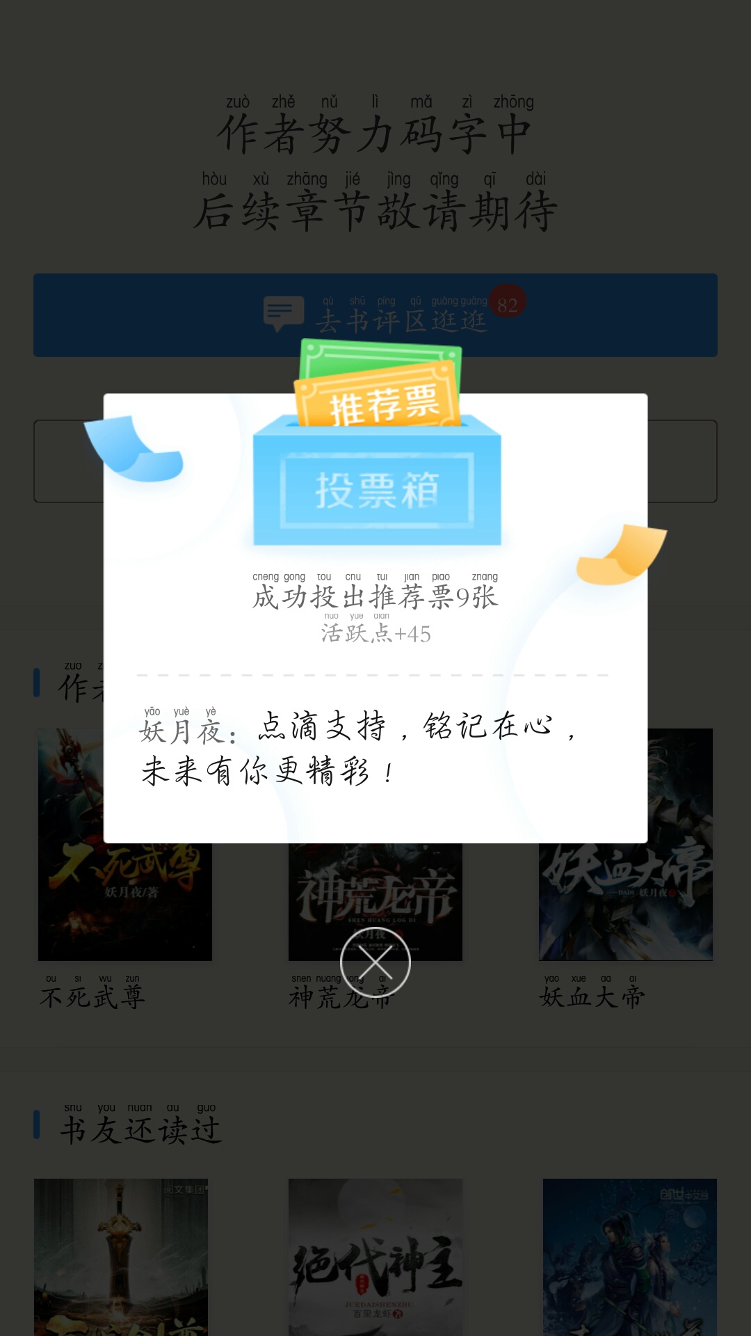 In "The Immortal Martial Lord" After finishing the book, about 20,000 readers paid attention to Lao Yao, and asked Lao Yao to continue writing the plot after the protagonist Xiao Yun went to the Ziwei Star Territory. In order to make up for the regrets in "The Immortal Martial Lord", the world structure of "The Immortal Martial Lord" has been completely improved. The old demon has always wanted to perfect the world of martial arts, so he created "The Immortal Martial Emperor" The plot of this book is more exciting than the Immortal Martial Lord, and it is also the most satisfying, relaxing, and favorite book I have ever written. Readers who have read "The Immortal Martial Lord" must not miss it, because "The Immortal Martial Lord" is not only better-looking than "The Immortal Martial Lord", but the story of the Ziwei Star Territory and the protagonists of "The Immortal Martial Lord", Xiao Yun and Xiao Zhantian, will also appear in the later stages. Because it is a new book, it needs to continuously accumulate readers and increase exposure, so that a book can really become popular. Only when the book becomes popular can the author write with peace of mind and write wonderful stories. Therefore, this requires the full support of all brothers and sisters. Coincidentally, this time, QQ Reading held a fan support season event. If the top ten books in the event can be vigorously promoted, this is extremely important for a new book. The old demon needs everyone's support. Tomorrow, you can click on the topic of "Support Season" from QQ Reader's [Discover-Receive Benefits] and support Yaoyueye. 1. Look for [Yao Yue Ye] and join Yao Yue Ye's [Martial Alliance] team. 2. A reader can only choose one team to join, and cannot change teams midway, so brothers and sisters, be sure to choose [Yao Yue Ye].