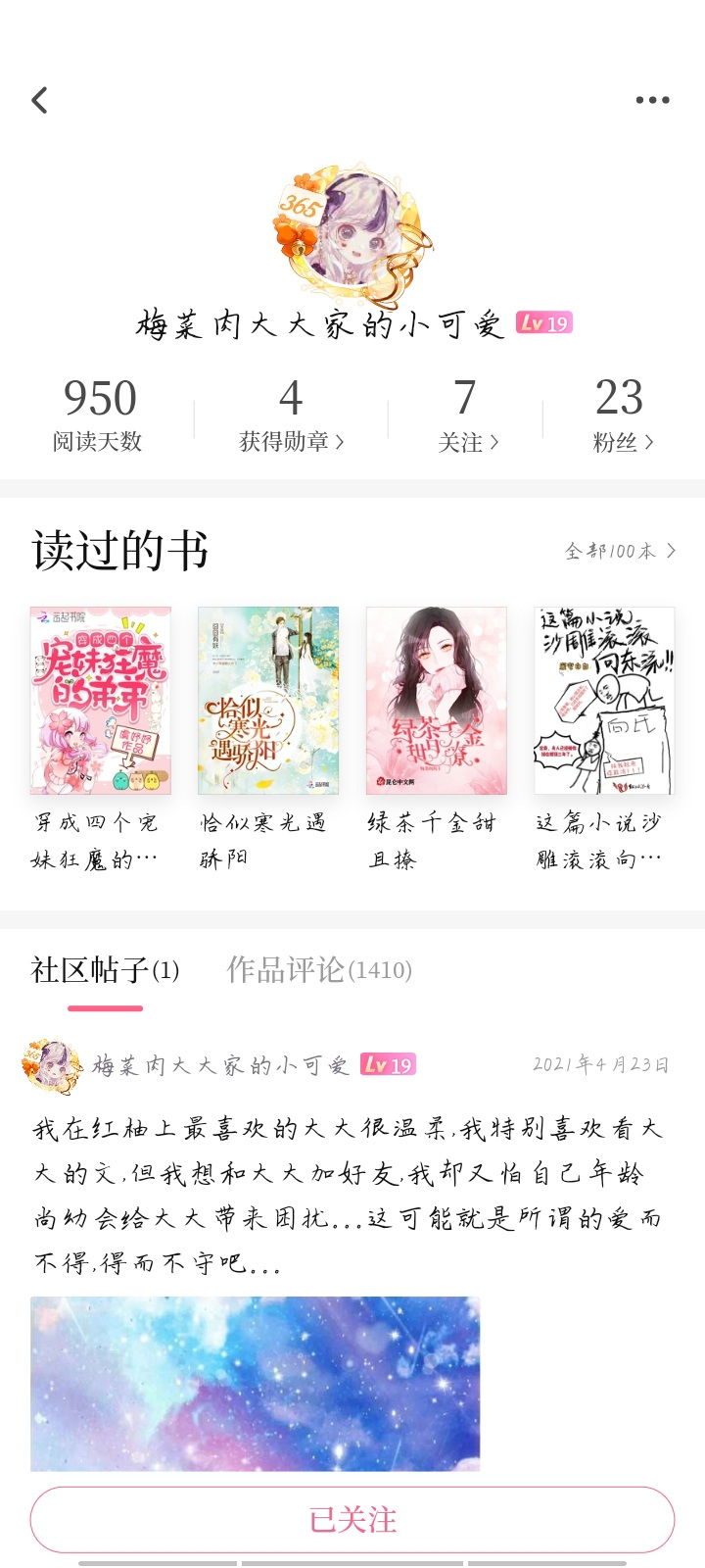 I first met Mei Caicai at the beginning of her first book. At that time, I met her just because of a recommendation by chance. After I met her, I would comment on her every day and evaluate the details in the novel. Although I didn't know more about Mei Cai, I only knew that she was a writer. First of all, Zhang Tu was my initial account, but something went wrong later. I ignored it when I was in the third year of junior high school. I changed my account after the high school entrance examination. I found that Mei Caicai had opened two more books, but I found that Mei Caicai had not been updated for a long time. What I want to say is that some people may not always be around Meicaicai, but some people are still there.