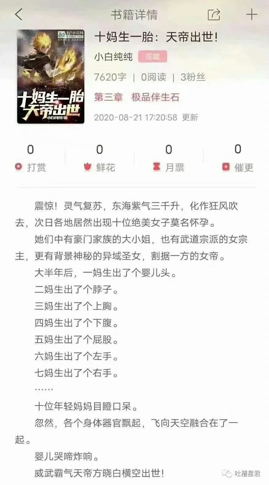 From the current point of view, the writing is quite good. I hope the author will not collapse later. In addition, since the little white tiger is set to use the sun to train his body, I suggest the author add another one to use the moon to train his soul, and then use the flying sword technique. Wouldn't it be better?