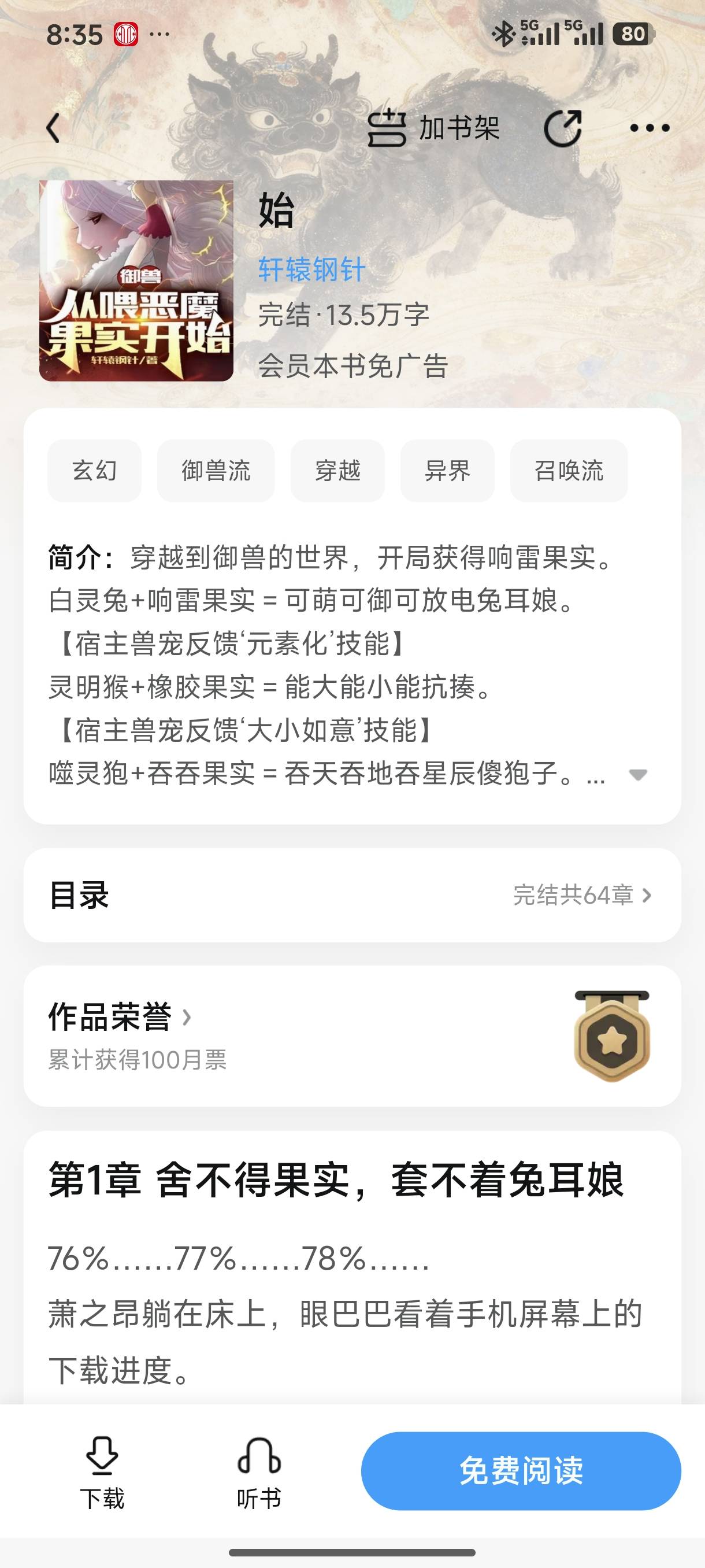 Travel to the world of beast control and get the thunder fruit at the beginning. White Spirit Rabbit + Thunder Fruit = Cute, Royal and Dischargeable Rabbit Ear Girl. [The host pet feeds back the 'Elementalization' skill] Smart Monkey + Rubber Fruit = Can be big, small, and can withstand beatings. [Host pet feedbacks the 'big and small' skill] Spirit-eating roe deer + swallowing fruit = swallowing the sky, swallowing the earth, swallowing the stars, silly roe deer. [Feedback from the host pet...] Finally one day, when the indescribable terrifying existence came, all the creatures in the world were horrified to see that even the beast pets of the Great Sage Xiao Zhiang were defeated one after another, and the world was no longer able to resist. Xiao Zhiang stood up. "It was unnecessary not to take action before. Now... Remember my name. My name is Xiao Zhiang. Xiao means arrogant Xiao, and Zhiang means arrogant Zhang."