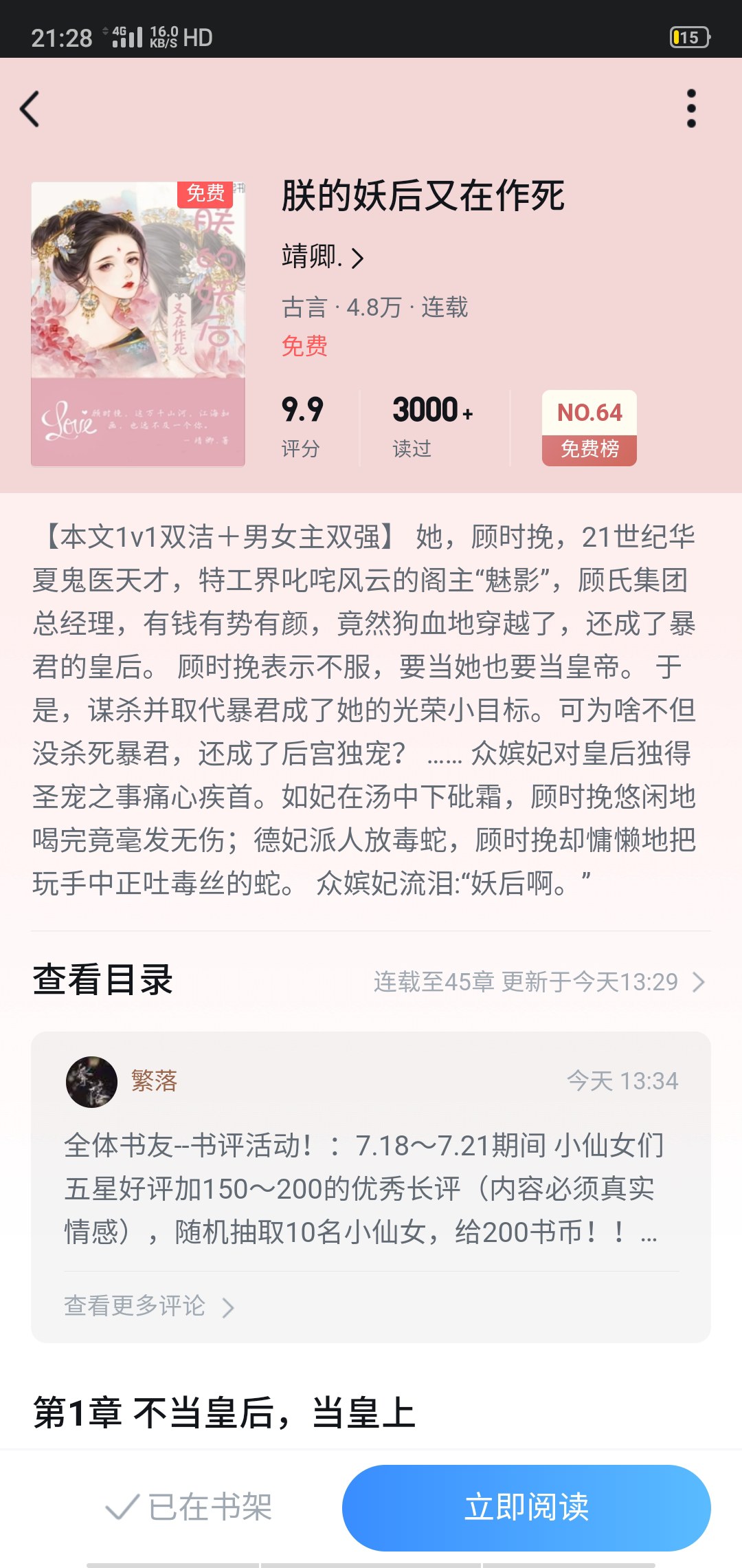 First, let's talk about the characters in Qingqing's works! The female patron, Gu Shiwan, is a Chinese ghost doctor genius in the 21st century, the feared master "Phantom" in the secret service world, and the general manager of the Gu Group. She is rich, powerful and beautiful, but she has traveled so cruelly to this ancient time that is so poor that there is no air conditioning. She is Gu Shiwan. The original owner, Gu Shiwan, was the only daughter of Prime Minister Gu. She was the most beautiful woman in the capital. She was such a beauty who only fell in love with Jun Yinan, the younger brother of the current emperor. But during the Queen Mother's birthday party, the original owner fell deeply in love with the Queen Mother and named her the queen of the tyrant Jun Yiheng. On the wedding day, the original owner hit a wall and died. Then Gu Shiwan came to ancient times, traveled to ancient times, and became the wife of a tyrant. Gu Shiwan expressed dissatisfaction and wanted to become the emperor! So the story of our tyrant and redemption begins~ Maybe when they fall in love, Tuanwan will remember that her original goal was to murder the tyrant and become the emperor~ ------Boundary line---- As for our author, his writing style is great and the plot is amazing. I am also a newbie who has only been in the game for a few days. Then I wish Qingqing will become more and more popular🔥. I confess my love to Qingqing~ Take a sip~