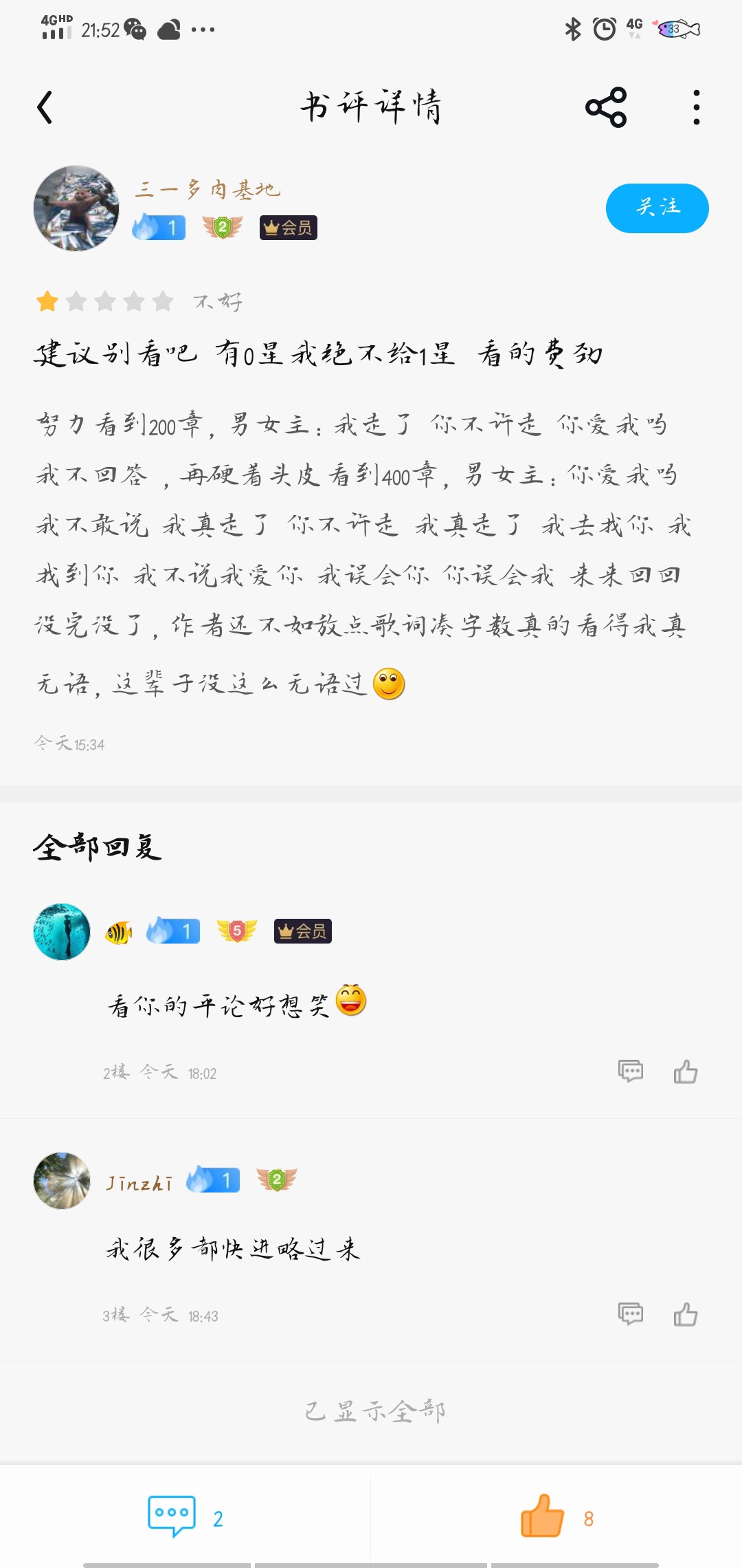 I have read more than 300 chapters, and I really don't know why I want to keep reading🙃. The emotional scenes between the male protagonist and the female protagonist are as smelly and long as a stinky rag. I want to kill the male and female protagonist and throw them into the smelly ditch. I took a screenshot of a reader's comment and thought it was very appropriate.