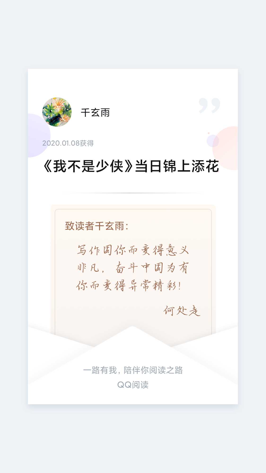 Don't say that the world is cold because you haven't waited for the warmth of the sun. The gentleness of the world, the witty words of all things, everything is the best arrangement. When you choose to start, you don't want to be spectacular or have flowers and angry horses. I hope that you will live up to yourself along the way; I hope that at the end, your eyes will still be bright, your heart will still be filled with stars and the sea, and your smile will not change when the flowers wither. --Gift to Xiao Feng
