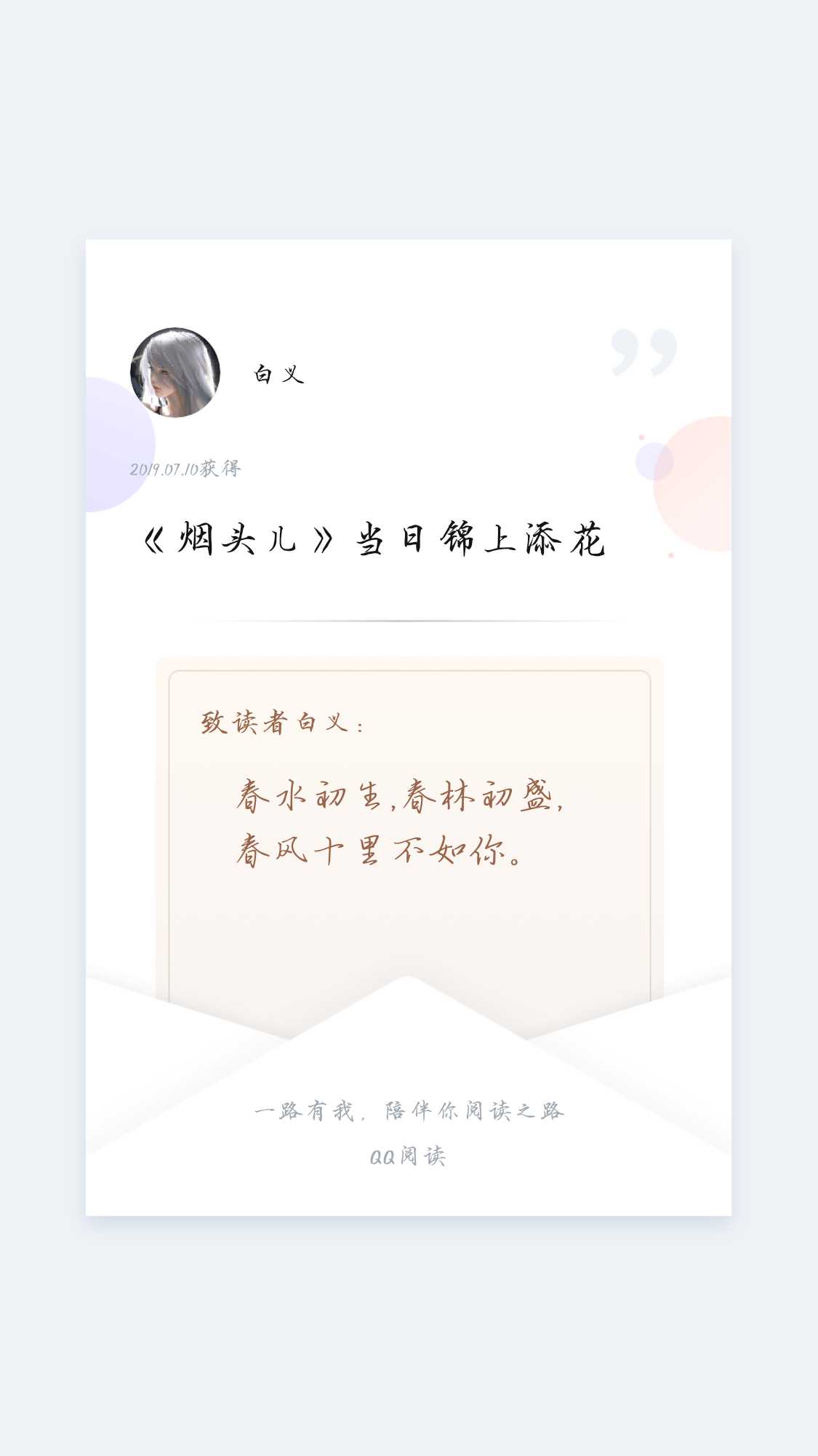 I just figured it out today that authors can also leave comments hehehe. Along the way, I wanted to give up countless times because the plot was not smooth, the characters were not fleshed out, and the story was not attractive. This book mainly records the people and things around me. I am trying my best to use living characters to explain the ignorance and confusion of our generation. In twenty days and just over 80,000 words, we have seen a lot. Tian Xu, who has a discordant family and rarely feels his father's love, has gone from low self-esteem to perseverance due to the warmth along the way. He may seem inspirational, but in fact he still has his own fragility; Tian Yulin seems to be a ruffian who does not do his job properly; Although the following April was enthusiastic and lively, it suffered from the feudal abuse of the family that favored sons over daughters; Zhao Keer is a typical example of a harmonious family, silly and sweet; Tang Lingling seemed considerate and cute, but she was just a tool to protect herself, but she had to be separated from her love because of her foreign residence registration; Wang Ran was unsocial because of the endless violence he suffered as a child; Although Teacher Huo always criticizes Tian Xu, she is the first teacher who wants to help Tian Xu change the current situation... "Cigarette Butt" continues, and the cigarette butt never goes out. In the future, there will be a generation of young people who have the confidence to pursue their dreams, but also the fear of falling to the bottom. We are confused and at a loss, but we still insist on ourselves. We have also taken the wrong fork in life, and we have insisted on taking a detour that is not favored by our elders. We have always moved forward, and we have never retreated. I just read the big data of "Cigarette Butt". Now 141 readers have collected my novel, and a total of 717 recommendation votes have been received in 20 days. I'm not trying to flatter you, it's really the constant support from all of you readers that has given me the confidence not to give up, to keep writing, and to explore new characters. Thanks to everyone around me who are willing to appear in "Cigarette Butt" under pseudonyms and modified identities, even if there are some things they have buried deep in their hearts for a long time. Thank you. I was chatting with my friend just now, I'm thinking about whether to apply for publication with 100,000 words or less. After being put on the shelves, you can get a perfect attendance bonus by updating a fixed number of words every day; But readers need to pay to read the article. Probably a few cents per thousand words. It's just an idea, it doesn't really have to be put on the shelves. I bow again and thank all the readers who support, encourage, and criticize me. Thank you to everyone living around me Thanks! Thank you. I sincerely wish you all a bright and bright future. I hope to get more criticism and advice from everyone. Thank you everyone!