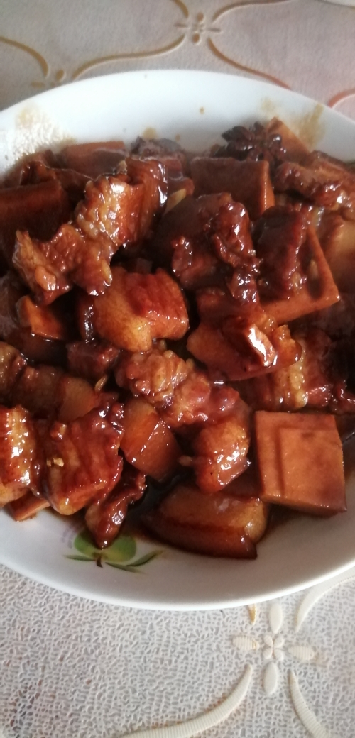 Homemade braised pork. Boil it in water first to remove the ring smell, remove it, wash it and cut it into pieces. Prepare minced ginger, minced garlic, star anise, peppercorns, cinnamon, sugar, bean paste, dark soy sauce, light soy sauce, and cooking wine. Put oil in the pot, add sugar (rock sugar is better), heat until melted, add the cut meat and stir-fry until sugar color, add cooking wine, dark soy sauce, bean paste, ginger and other seasonings. Cook for forty minutes, remove the juice and remove from the pot. Just a plate of braised pork with full color, flavor and flavor! !
