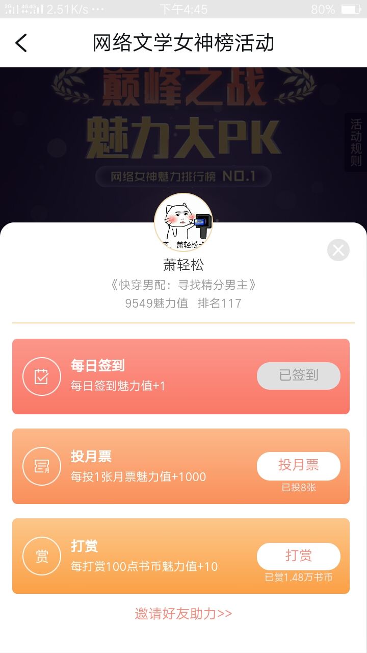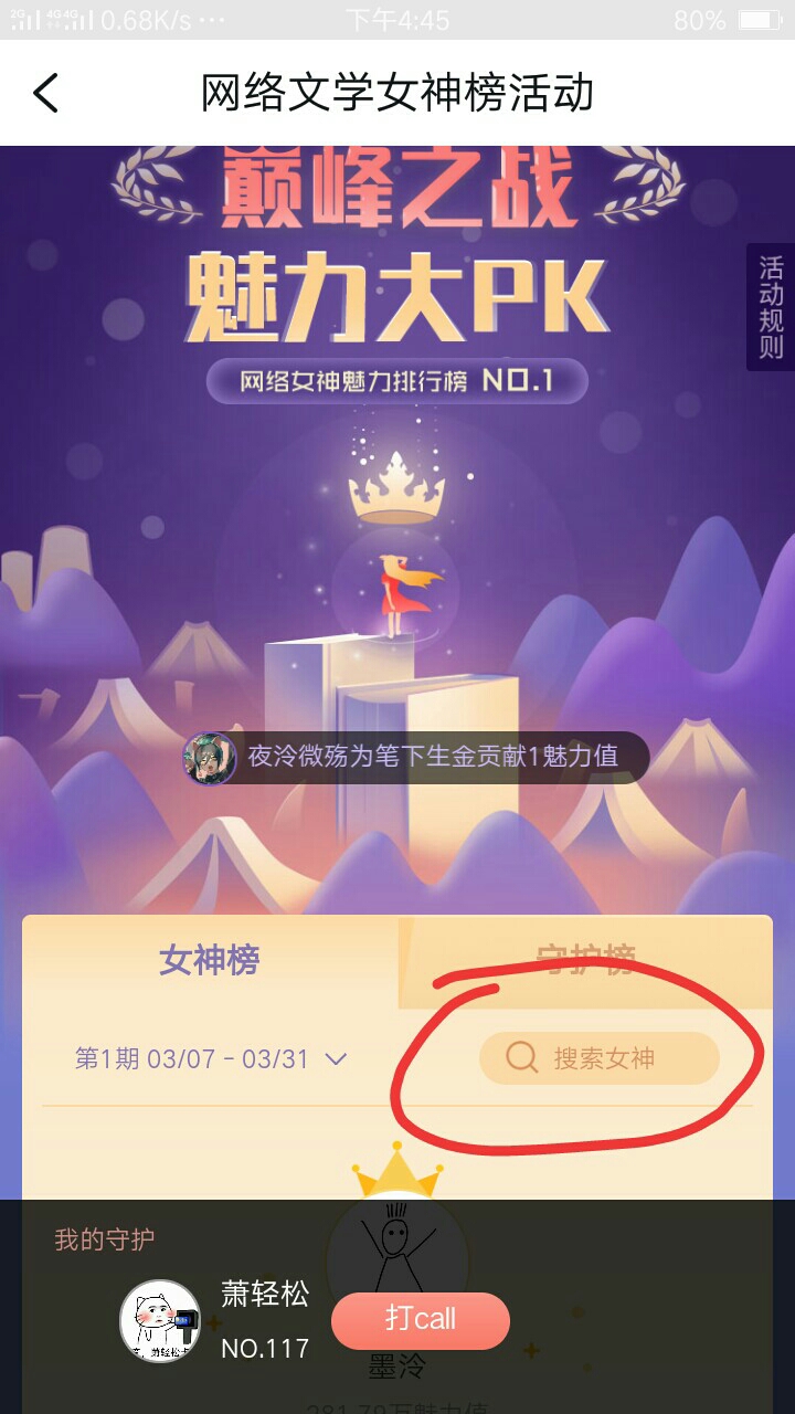 Support Er Song! ! Call Ersong~ Steps: Click on Discovery - Activities - Find the Goddess Activity - Click on search "Xiao Qingsong" - sign in, vote monthly, and reward Activity rules: 1. Event time: 10:00 on March 7 - 24:00 on March 31 2. During the event, users can increase the charm points of writers who have signed up for the competition by signing in every day, voting monthly and giving rewards. The charm points sent by users will be converted into guardian values and displayed on the guardian ranking list. 3. When users sign in on the writer page every day, the goddess's charm value will be +1, limited to once per day; Cast a monthly vote for the writer, and the goddess's charm value will be +1000. The vote limit is the same as the monthly vote rules; For every 100 book coins or reading points rewarded, the goddess's charm value will be +10, and there is no limit to the reward amount. 4. Users who successfully send 1,000 charm points in this event will receive the "Charming Support" medal and the "Charming Support" avatar pendant after the event.