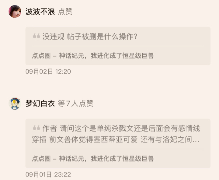 It was because the author actively communicated with readers at the beginning that I followed it. As a result, a post about the relationship line was posted in the book circle, as shown below. I didn't ask this person the next day. This person's reply was a violation. If there is no violation, your post will not be deleted. If there is no violation, your post will be completely violated. No wonder your book circle is just bragging about you. All those who have some opinions are deleted.