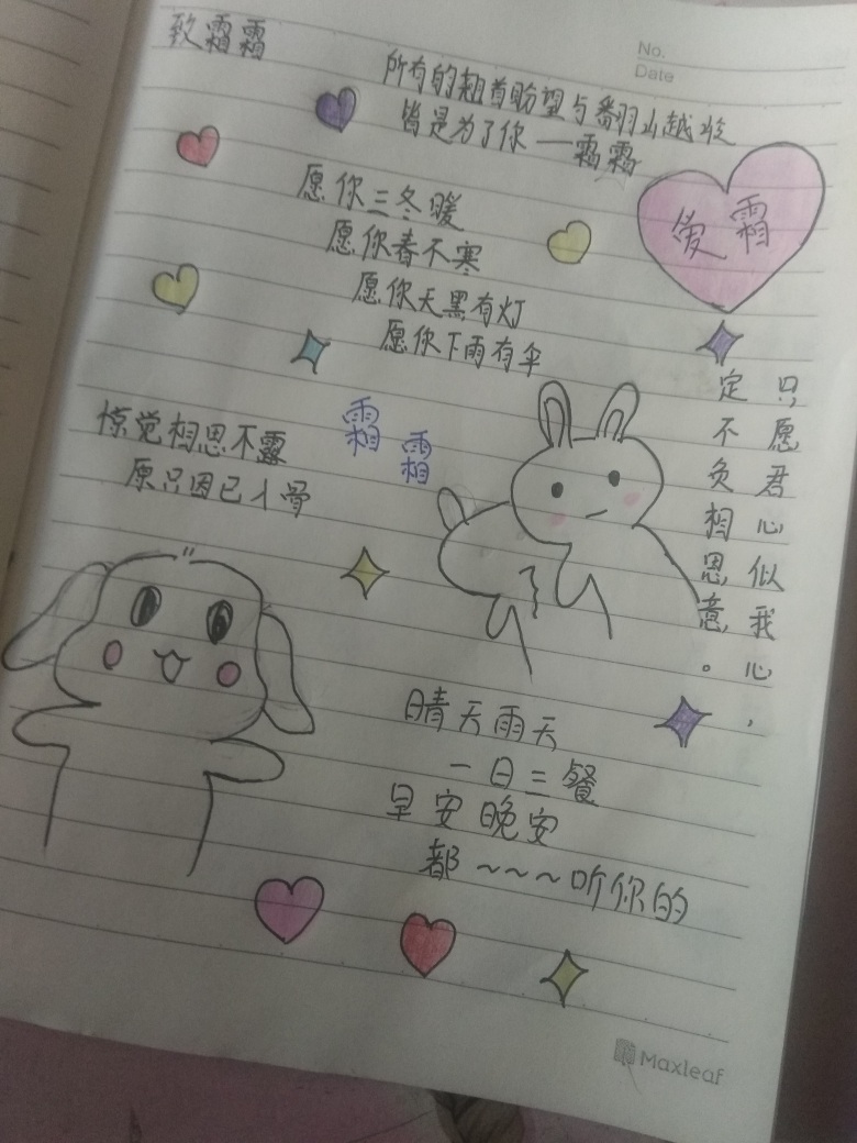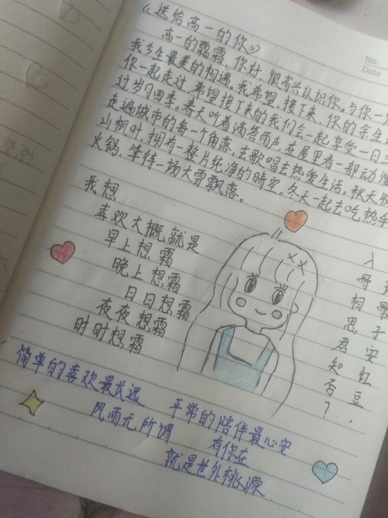 Frost frost All the longing and overcoming mountains and ridges are all for you - Shuangshuang. May you be warm in winter, may you not be cold in spring, may you be cool in summer, may you be warm in autumn, may you have a light when it's dark, and an umbrella when it rains, may you have food when you're hungry, and may you have clothes when you're cold, may you be accompanied by loved ones and best friends on the road, may all your happiness be without pretense, may all your sorrows be without covering up, may you be happy in this life, be sincere and kind, may you be happy and untroubled in your life! I only hope that your heart will be like mine, and I will live up to my love! Sunny day, rainy day, three meals a day, good morning, good night, it's all up to you. (For you who are a freshman in high school) Hello, Shuangshuang, a freshman in high school. Nice to meet you. Feeling like old friends at first sight is the most beautiful encounter in my life. I hope that I will accompany you for the rest of your life. I hope that we will enjoy three meals a day together and spend the time and seasons together. In spring, I listen to the sound of rain and watch an anime in the house. Summer travels to every corner of the city to sing and love life. In autumn, there are maple leaves all over the mountain and a pure clear sky. Let's eat hot hot pot together in winter and wait for the heavy snow to fall. I want: Like probably: I miss frost in the morning, I miss frost at night, I miss frost every day, I miss frost every night, I miss frost all the time! Simple love is the longest lasting, and long-term companionship is the most peaceful. Wind and rain don't matter, With you here, It's a paradise! Do you know that the red beans on the exquisite dice make you miss me deeply?