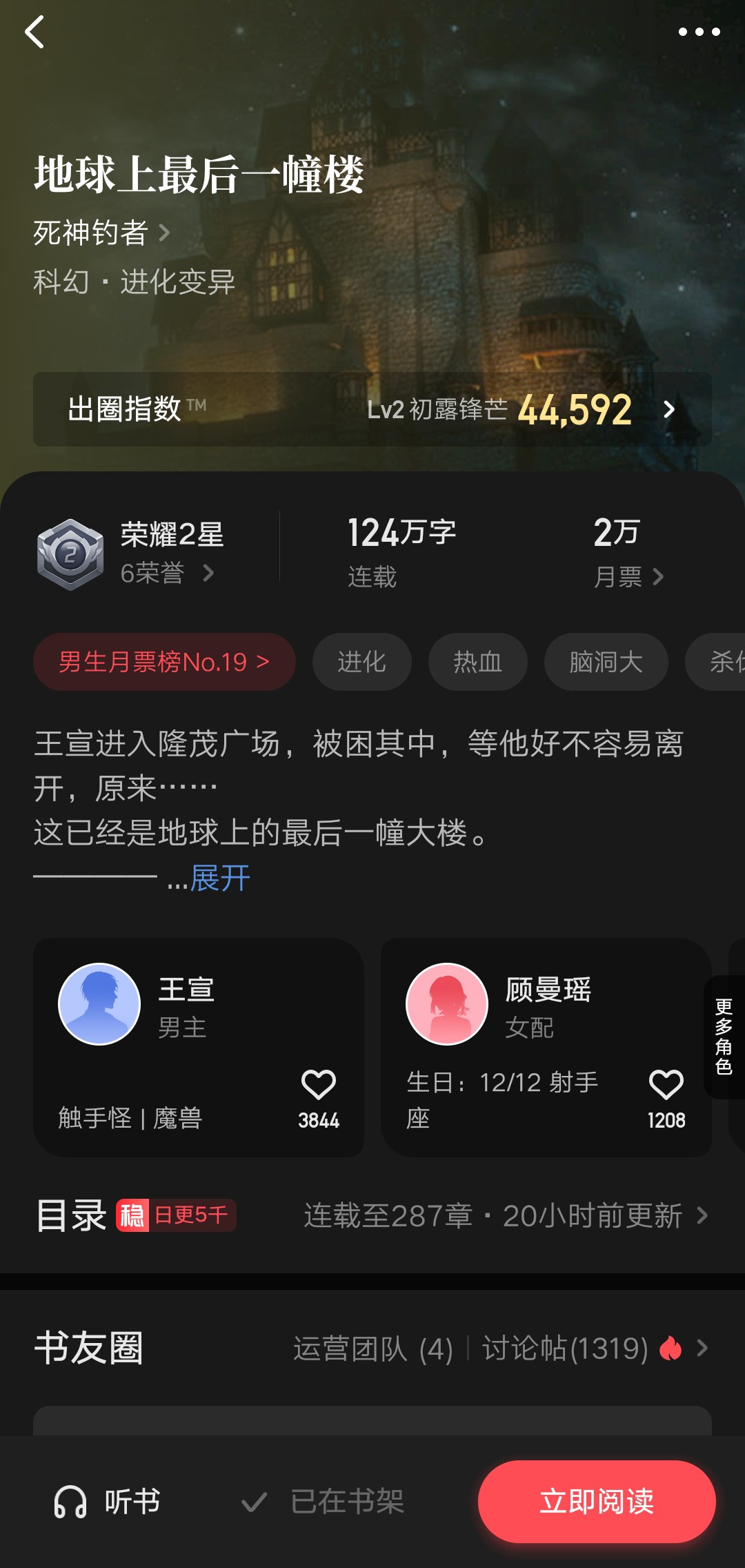 Group survival works. I read twenty chapters in one go and had endless aftertaste. The characters are stable, the characters have their own merits, and the plot is quite smooth and doesn't seem particularly brainless. And everyone is talking about the shadow of the God and Demon Breeding Farm, which seems pretty good. To briefly explain the plot, the protagonist and his four friends met for a barbecue and came to the parking lot of the building. They suddenly encountered a power outage. As a result, monsters appeared in the darkness, and they kept wandering around the F area of the parking lot until several people died and a teammate was added. The group came to the G area.