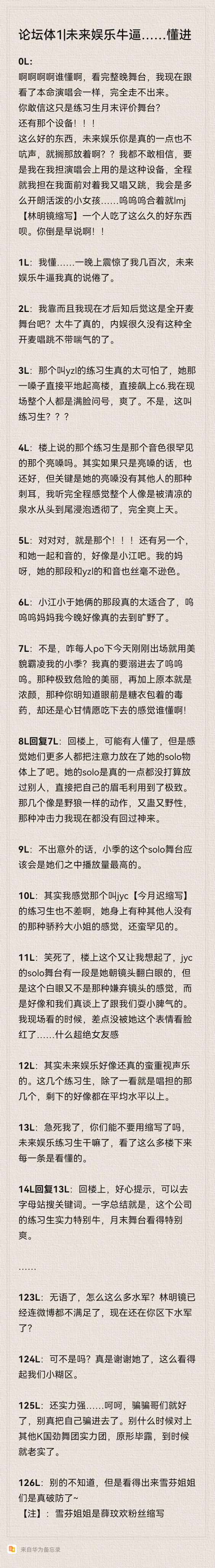 0L: Ahhhhhhhhhhhhhhhhhhhhhhhhhhhhhhhhhhhhhhhhhhhhhhhhhhhhhhhhhhhhhhhhhhhhhhhhhhhhhhhhhhhhhhhhhhhhhhhhhhhhhhhhhhhhhhhhhhhhhhhhhhhh who knows, after watching the whole night on stage, now I am just like watching my benming concert, unable to leave at all. Can you believe this is just a stage for trainees' end-of-month evaluation? And that device! ! ! With such a good thing, Future Entertainment, you really didn't say anything at all and just left it there? ? I can't believe that if I had used this kind of equipment in my concert, and I would have been singing and dancing in front of me throughout the whole process, what a cheerful and lively little girl I would be... Wow, oh, oh, lmj [Lin Mingjing's abbreviation] has eaten good food alone for so long. You should have told me earlier! ! 1L: I understand... It shocked me hundreds of times in one night. I'm really tired of saying that Future Entertainment is awesome. 2L: Holy shit, and I only realized in hindsight that this was a full-mic stage, right? It's really awesome. It's been a long time since domestic entertainment has had this kind of full-on mic singing and dancing without panting. 3L: That trainee named yzl is really scary. Her voice can lift the sky from the ground up to c6. I was full of question marks at the scene. I was so happy. No, this is called a trainee? ? ? 4L: Is the trainee mentioned above the one with a rare bright voice? In fact, it would be okay if she just brightened her voice, but the key is that her bright voice is not as harsh as others. When I listened to the whole song, I felt like my whole body was soaked in cool spring water from beginning to end, which was completely refreshing. 5L: Yes, yes, that's it! ! ! There was another one, and the one harmonizing with her seemed to be Xiao Jiang. Oh my gosh, her harmonies are not inferior to yzl's. 6L: The part where Xiao Jiang is younger than the two of them is really suitable. Wow, wow, mom, I feel like I really went to the wilderness tonight. 7L: No, how come everyone is posting about Xiao Ji who just came out today and used his beauty to bully me? I'm really going to drown in it. Woohoo. Who knows that kind of extremely dangerous beauty, coupled with the original thick face, the feeling that you know clearly that there is sugar-coated poison in front of you, but you are still willing to eat it! 8L replied to 7L: Back upstairs, some people may understand, but it feels like more of them are focusing on her solo. In her solo, she really didn't intend to let others go, and directly used her eyebrows to the extreme. Those few wild wolf-like movements were so venomous and wild, I still haven't recovered from the impact of that kind of impact. 9L: If nothing else, Xiao Ji's solo stage should be the most played among them. 10L: Actually, I feel that the trainee named jyc [the abbreviation of Jin Yue Chi] is not bad either. She has a kind of arrogant young lady feeling that other people don't have, which is quite rare. 11L: I laughed so hard. This thing above reminded me again. There was a section of jyc's solo stage where she rolled her eyes at the camera. But the eye roll was not like she disliked the camera, but she seemed to have a real relationship with us and was having a bad temper with us. When I watched it live, I almost blushed at her expression... What a super girlfriend feeling 12L: Actually, Future Entertainment seems to really attach great importance to vocal music. Among these trainees, except for the ones who seemed to be singing, the rest seemed to be above average. 13L: I'm so worried. Can you please stop using abbreviations? What are future entertainment trainees doing? After reading so many times, I can understand every one of them. 14L replied to 13L: Go back upstairs. Kindly remind you that you can search for keywords on the Alphabet website. To sum it up in one word, the trainees of this company are very good, and the stage at the end of the month is very exciting to watch. ... 123L: I'm speechless. Why are there so many trolls? Lin Mingjing is no longer satisfied with Weibo. Now he is still a troll in your area? 124L: Isn't it? Thank you so much to her for thinking so highly of our little neighborhood. 125L: He's still very powerful... Haha, just lie to your buddies, don't really lie to yourself. Don't ever face other powerful K-country Audition groups. Your true colors will be revealed, and you will be honest when the time comes. 126L: I don't know about anything else, but I can see that Xuefen and the sisters have really broken through their defenses~ [Note]: Sister Xuefen is the abbreviation of Xue Wenhuan's fans