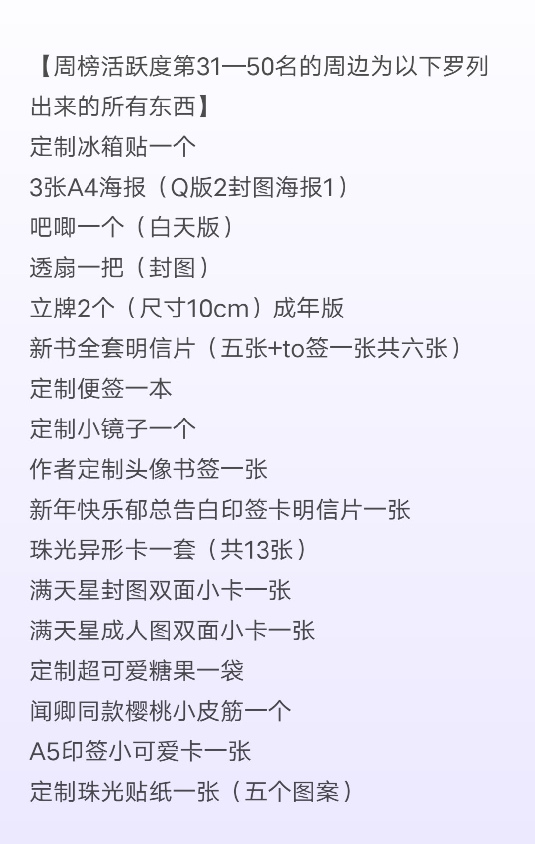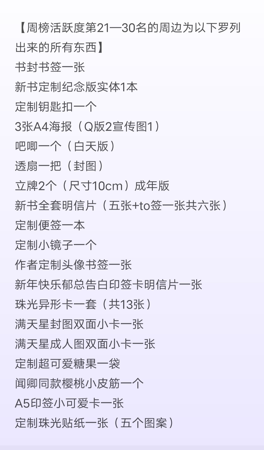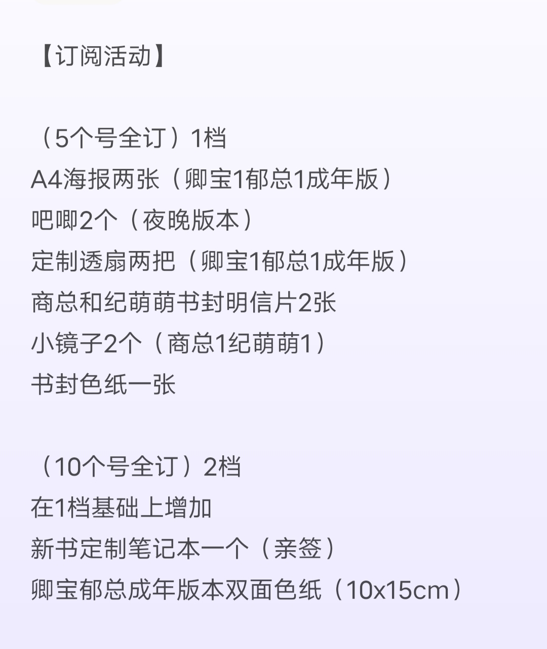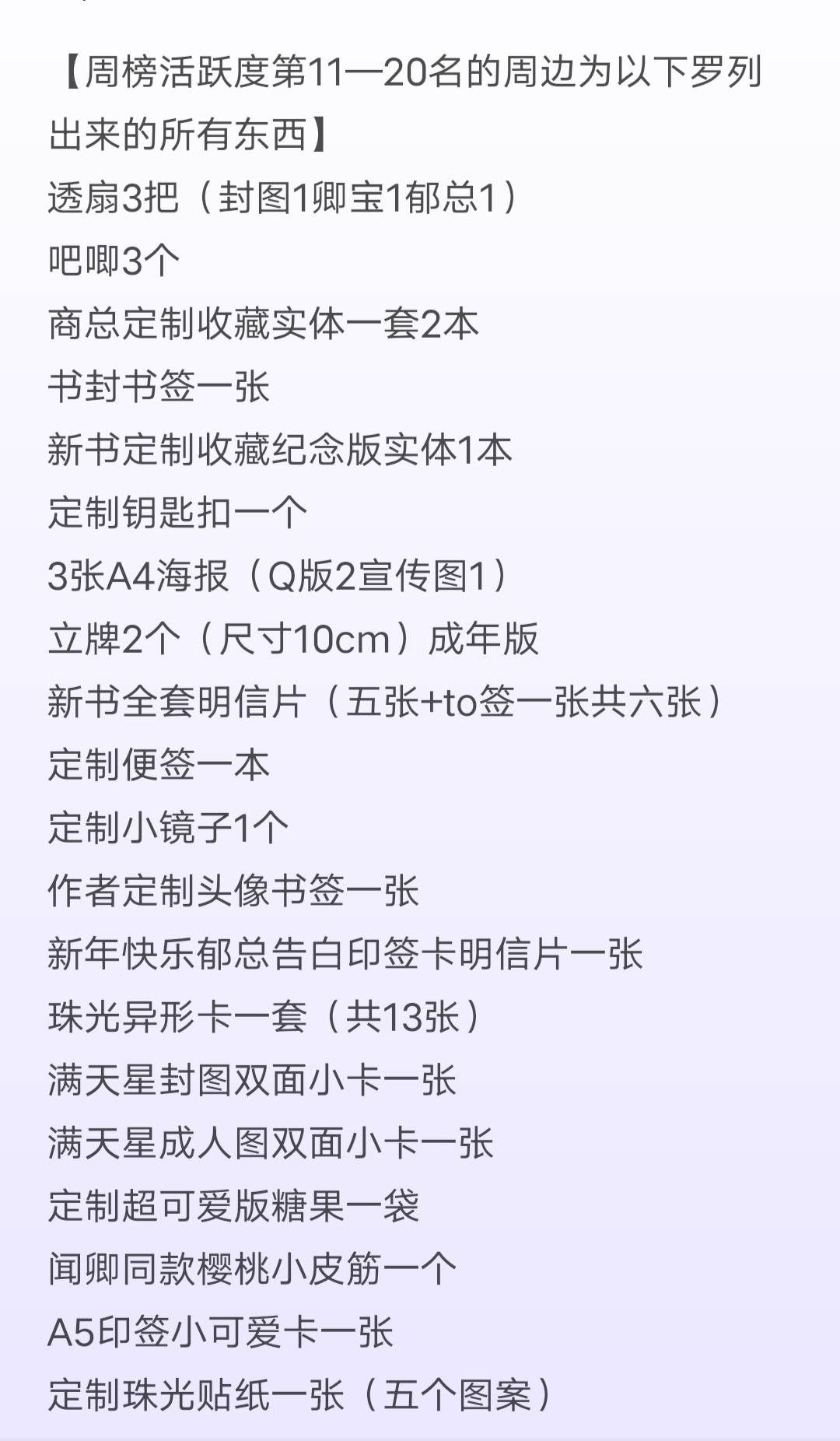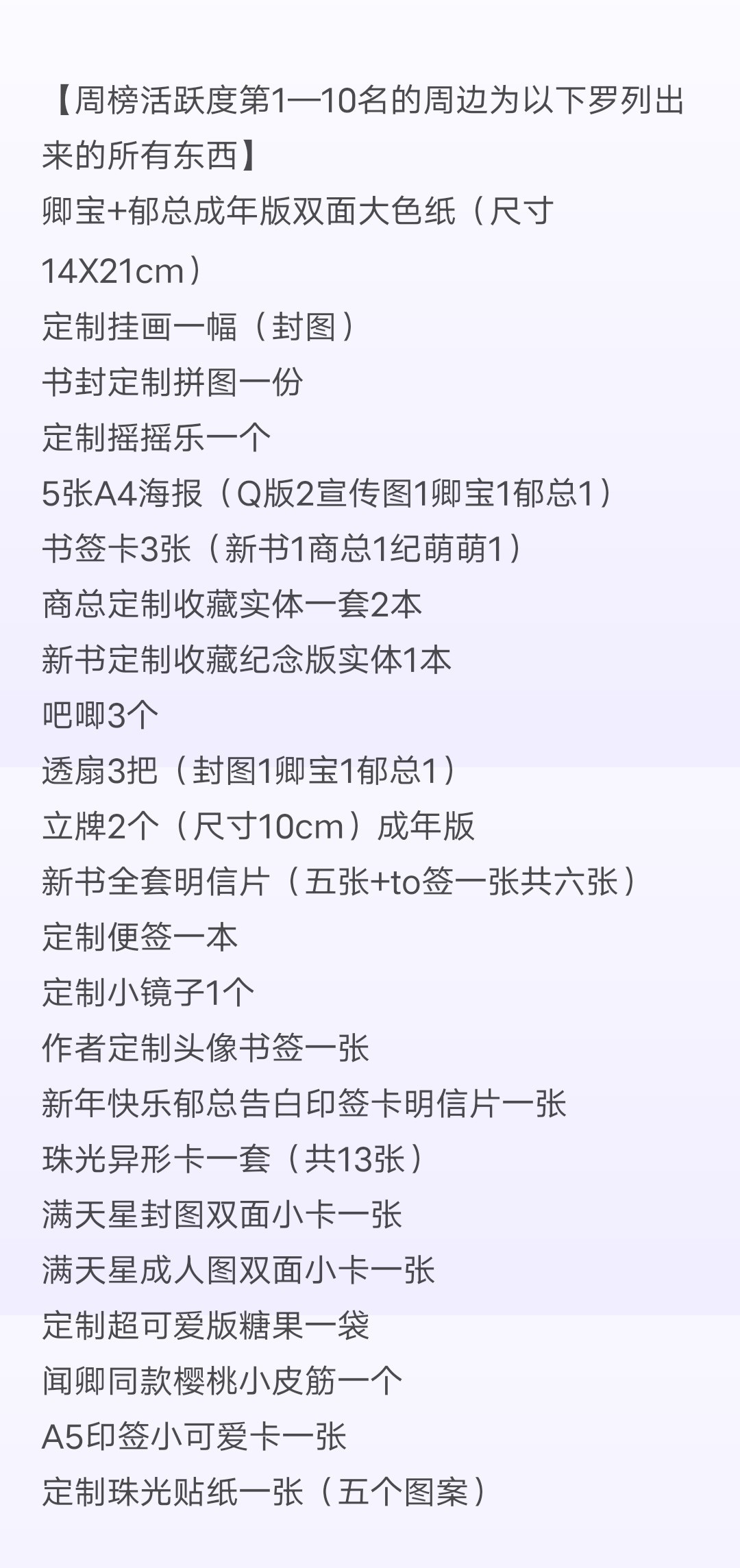As I said before, many babies should be familiar with the fact that some books are paid and some are free. Qingbao's book adopts a paid model. That is to say, you will be charged for reading some free chapters after it is released. A thousand-word chapter costs five cents, and there are discounts for those with high account levels. The full price of the reservation is about the price of a cup of milk tea. Whether you prefer free books or paid books. An'an hopes that you can support genuine reading. All reservations are based on your ability, and every baby is not forced to participate. If you like it, you can subscribe later after it is put on the shelves. If you don't like it, it doesn't matter. We are destined to meet again in the world. Maybe one day in the future you will see my book in the bookstore again! Thank you to everyone who clicked on this book, and thank you for your support! The following are some small on-shelf welfare activities that I have prepared. Please consume rationally! Consume rationally! Consume rationally! If you want to participate, participate, if you don't like it, just skip it and just ignore it. Listing activity time It will be available next Tuesday, September 14th Activity deadline September 14th (Tuesday) - September 19th (Sunday) at 23:59 [Rewards after 59 minutes are invalid] (Don't get stuck, don't get stuck, you are responsible for failure to get stuck) [1] The top 50 most active babies on the weekly list can receive a small physical peripheral gift that I carefully prepared for everyone! [2] Put on the shelves all physical gifts surrounding the event. (For more unlocks, you can follow the online event group) Remember to use your book coupons in advance. (Full order refers to the paid chapters from chapter 100 to the ones updated on the 19th.) (In addition to the disclosed physical peripheral gifts, I will also randomly place additional mysterious gifts in each physical peripheral gift box. I don't know the total value, I haven't calculated it, hahaha. I guarantee that every little cutie will get at least one random gift box in the peripheral gift box) Finally, please consume rationally. Please consume rationally. There will be many opportunities in the future! After all, everyone knows that I am a doting fanboy, from Brother Su to Mr. Shang to Ji Mengmeng, Qing Bao and other places. The surrounding items will be packaged in painted airplane boxes + bubble columns. (Anyone who has already got the baby knows that it is super beautiful) There are also many babies in the book review area who have posted pictures of the surroundings, so you can refer to them yourself. You can also see it by joining the listing activity group or following me on Weibo! List activity group number: 706864210 (You can exit on your own after the event. If you have any questions during the period, you can find me there, surrounding pictures, delivery, etc...) During the event, there will also be a daily red envelope shower in all its book club groups. [Final note: All winning peripherals will be sent out before the end of September to ensure that everyone can receive them during the National Day. In order for my dear babies to receive the peripheral products intact. I postponed my trip! Decided to do everything myself before leaving. Love you so much! Your October is a bunch of peripheral joy. As for me, I am going to spend my long month in the hotel. Okay, you don't need to say that to me. I said it myself, I am a stupid author with a lot of money, so I will leave first. See you on shelves! How many more explosions? You'll find out then! Daily update, super fat! Other books? Rise up and fill the hole. No matter how rich or noble you are, don't forget each other. I will always love and support you all. Finally, a friendly reminder: Consume rationally and you must consume rationally. For those of you who can't get your money back, it's risky to be on the list, so please don't get ahead. The surroundings for the fully booked event are also very good, and there will be more events in the future. I will also frequently give away peripheral items. Just do your best.