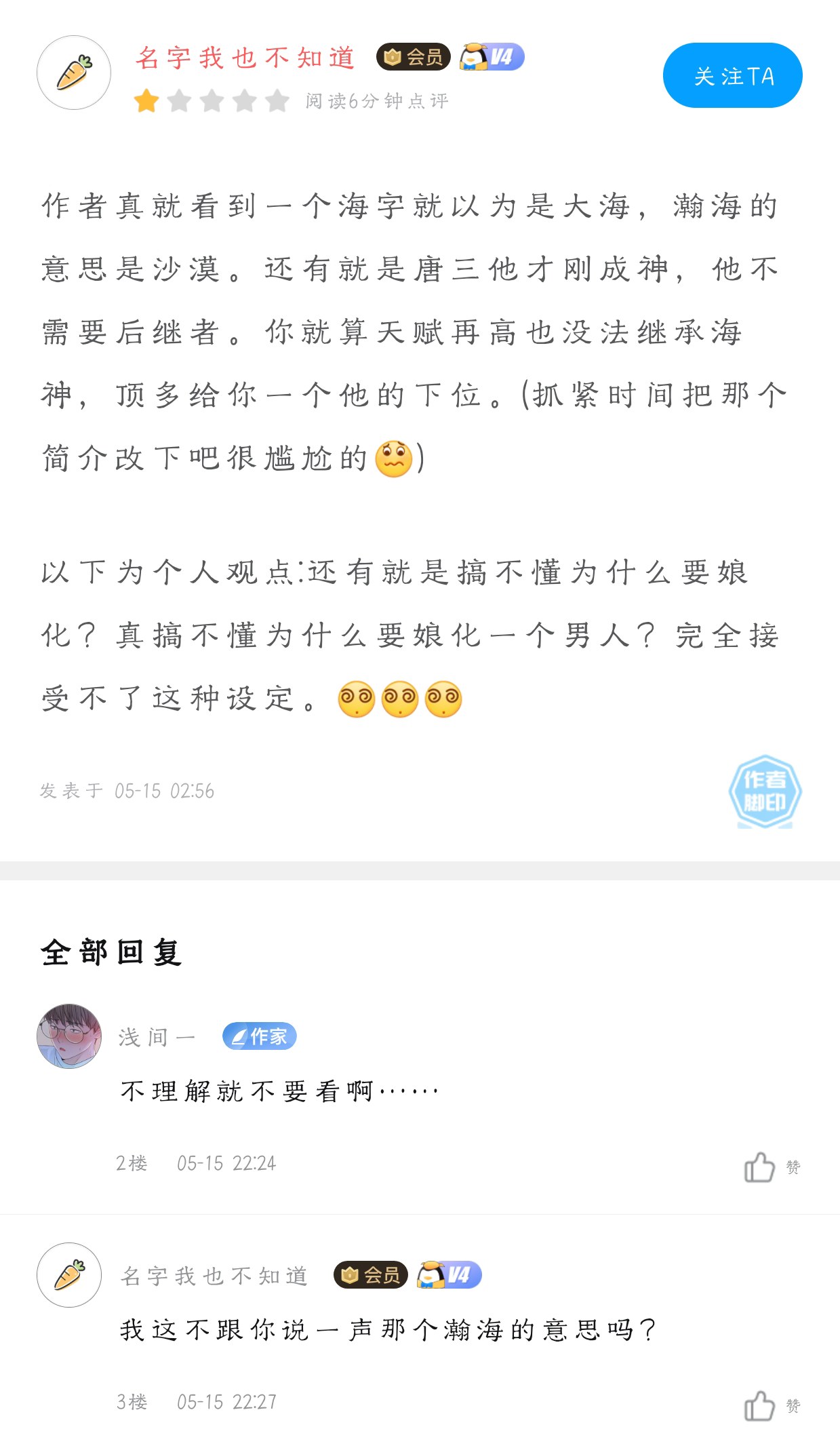 The author really saw the word "海" and thought it meant the sea. Hanhai means desert. Also, Tang San had just become a god and he didn't need a successor. No matter how talented you are, you can't inherit Poseidon. At most, you will be given a lower rank than him. (Hurry up and change that introduction. It's very embarrassing ) The following is my personal opinion: I also don't understand why you need to become a girl? I really don't understand why you want to transform a man into a girl? This setting is completely unacceptable. [Emot=default,35/]