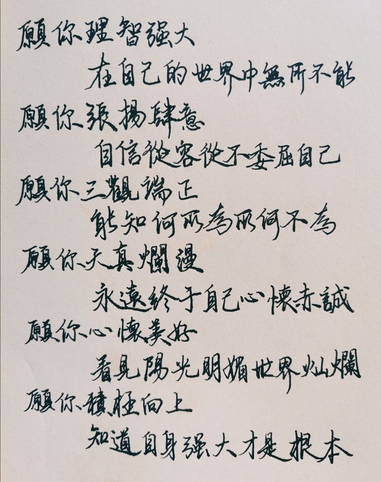 As in the title: May you be strong in reason and omnipotent in your own world. May you be assertive, confident and calm and never wrong yourself. May you have a correct outlook on life and be able to know for yourself what to do and what not to do. May you be innocent, always true to yourself and sincere in heart. May you have a beautiful heart and see a bright and sunny world. May you be positive and know that your own strength is the foundation. (I haven't written for a long time and my hand is a little shaky at the back. Please ignore the typos in the middle and the two words that are reversed. There are always typos and I don't want to rewrite them 1551