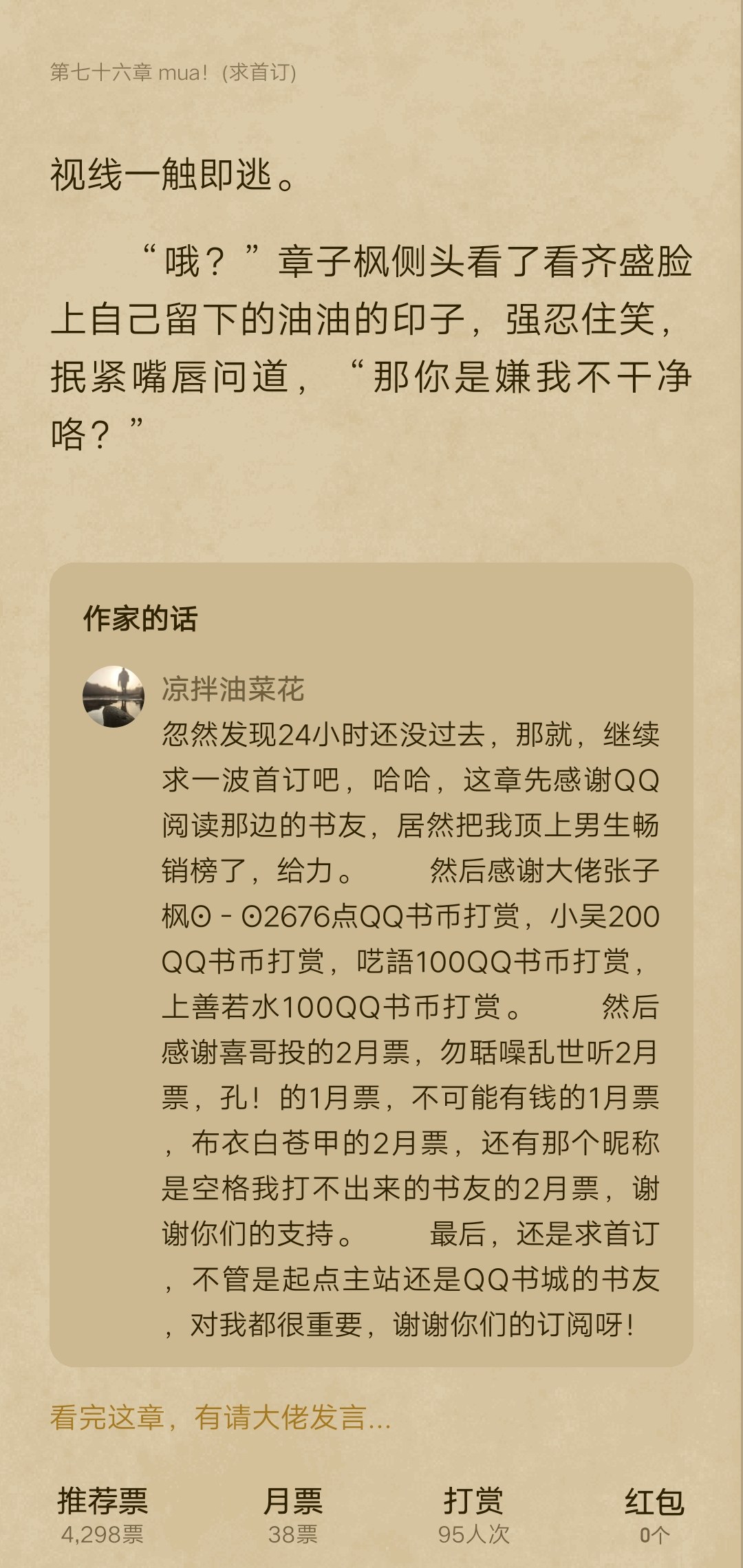 I don't know why the words from QQ reading friends were not displayed in Chapter 76, so I said it in the post. Thanks to Mr. Xizi for reminding me. In order to prove that I am not a posthumous thank you, I will post the picture of the author at the end of the chapter on the starting point. Haha, I also value the readers of QQ reading, especially your monthly tickets, haha. The following is the original speech. Suddenly I realized that 24 hours have not passed yet, so let's continue asking for first orders, haha. For this chapter, I would like to thank the book friends on QQ Reading for actually putting me on the best-selling list for boys. It's awesome. Then I would like to thank the boss Zhang Zifeng for the reward of 2676 QQ book coins, Xiao Wu for the reward of 200 QQ book coins, Yayu for the reward of 100 QQ book coins, and Shangshan Ruoshui for the reward of 100 QQ book coins. Then I would like to thank Brother Xi for voting for February. Don't make noises and listen to the votes for February in troubled times, Kong! 'S January ticket, Impossible Rich's January ticket, Buyi Bai Cangjia's February ticket, and the February ticket of that book friend whose nickname is a space that I can't type out. Thank you for your support. Finally, I still ask for the first subscription. Whether it is the main website of Qidian or the book friends of QQ Bookstore, they are very important to me. Thank you for your subscription!