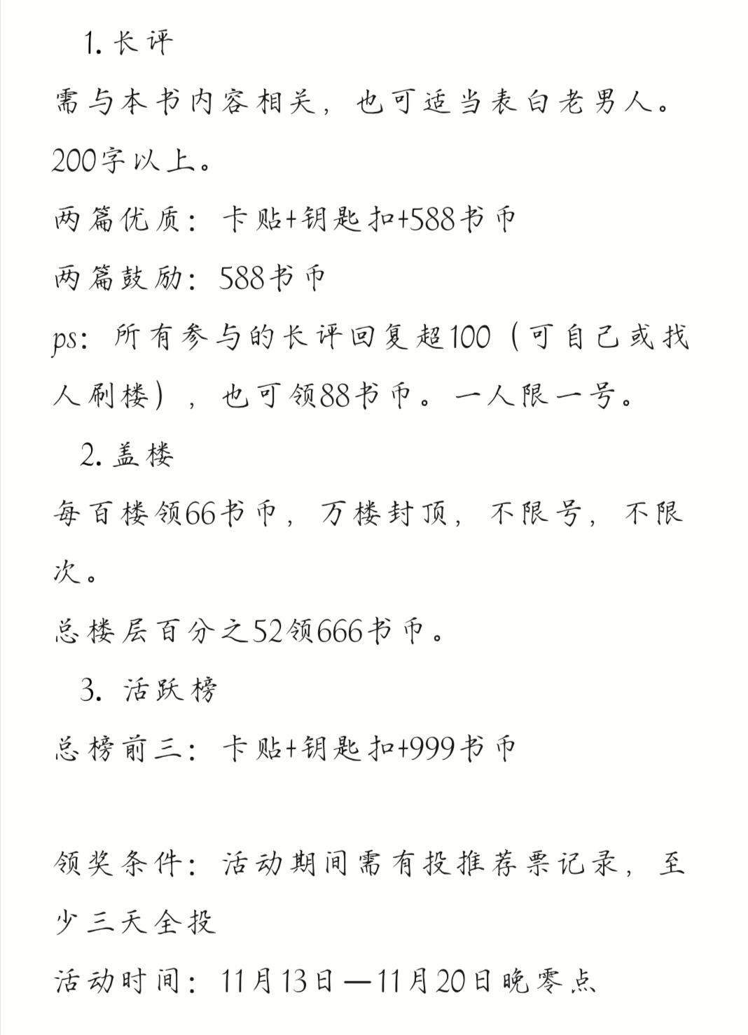 This book is new, and the rules of the book circle are all cliche, so I won't go into details ♡ Here are some tips for some collectors (that's me) or new fairies that are not troublesome but are very important to this book. Because this book is a new book, the early results are very important. If the results are not good, the editor will arrange a PK for the book. If the results are not good, the PK will not pass, and then the book will be put on the shelves faster (that is, for a fee), so the fairies can do a better job when stocking up on the book. ① Chasing volume, this pursuit of volume means looking at the number of clicks of readers on the latest chapter. The higher the pursuit, the better the results. So fairies can flip it to the latest chapter every time they see an update♡ ②Activity, this should go without saying~ The popularity of the book circle is the popularity of task completion, plus the popularity of refined posts and ordinary posts~ Fairies can do tasks in their free time, check in, and vote (voting here is not mandatory for everyone, but voting is an aspect of perfect attendance) ♡ ③ Take the refined post separately. The refined post is actually very simple (generally refers to a long review, I don't know how old men judge it. I have similar meaning in another circle, please point out if I am wrong). Just confess your feelings, write a biography of a character, and write down your opinion about the book or a certain character. It should be about 1,800 words (maybe a bit too much? I don't know this, that's usually what I do 😂) ④.... It's gone, it's gone, I forgot/black face + scratching head in embarrassment ✨✨✨✨✨✨ Thank you for your support, little cuties ✨✨✨✨✨✨ Old man, rush, rush! The future is promising. Because of the entrance examination, I may not have time to read the article, but I will try my best to complete the task. If you have neighbors, let szd! ! ! !