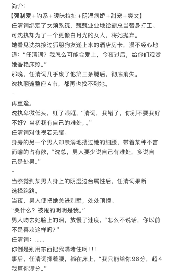 [Forced Love + Fishing + Ambiguous Pulling + Damp and Yandere + Sweet Pet + Cool Articles] Ren Qingci bound the system and worked conscientiously as a substitute for the boss. But Shen Zhi abandoned her for a woman who was more like Bai Yueguang. She saw Shen Zhi taking the hotel room card handed over by his friend, and said casually: "Ren Qingci? How could I fall in love? After tonight, I will show you her sexy photos." That night, Ren Qingci almost crippled him and disappeared completely. Shen Zhi searched the entire city A, but could not find her again. - See you again. Shen Zhi bowed his head humbly, his eyes red, "Qingci, I was wrong, please don't let me go, okay? I had my own difficulties at the beginning." Ren Qingci turned a blind eye to him. Another man beside her hugged her waist lovingly, with some unspoken possessiveness, "Mr. Shen, men should talk less about their difficulties and more about being a virgin." - After noticing the dank side stage attributes of a certain man, Ren Qingci decisively chose to run away. That night, the man took her into the villa. "Why are you crying? It's obviously me who was dumped." The man kissed away the tears on her face, "Why don't you say anything? Didn't you like this before?" Ren Qingci:...... Don't block my mouth with something! ! !