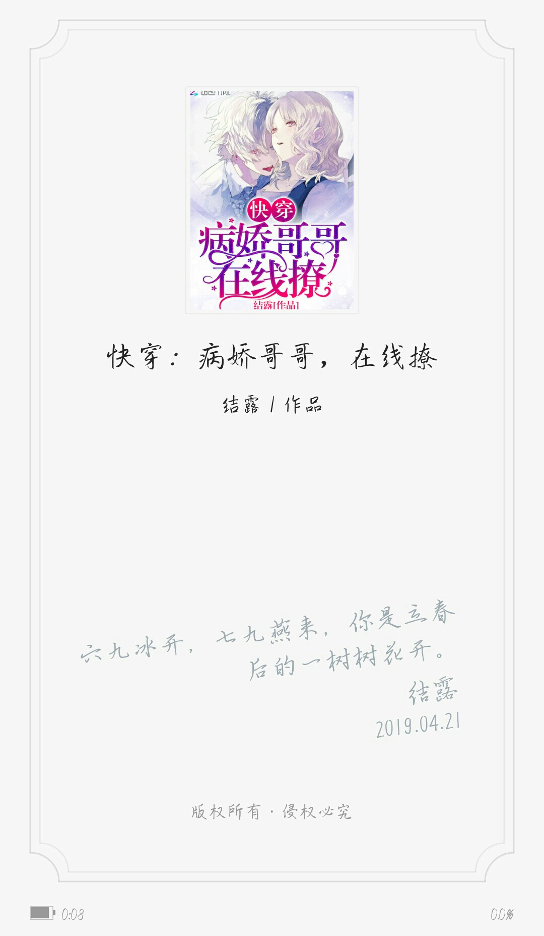 We don't know anything, we don't dare to ask anything, we just want to cry. I feel uncomfortable and want to cry. We don't know when the straw will be the last straw that breaks the camel's back. I don't understand why a new book has a rating of 8.1. Is it because my writing is not good? Why don't you point it out? You must not know how uncomfortable it would be to receive only such a reward for a book that you have put so much effort into. It's my idol's birthday today, I don't want to feel uncomfortable. I know that without a fan base, the book's ratings will only get lower and lower. Sorry, the author's glass heart was accidentally broken.
