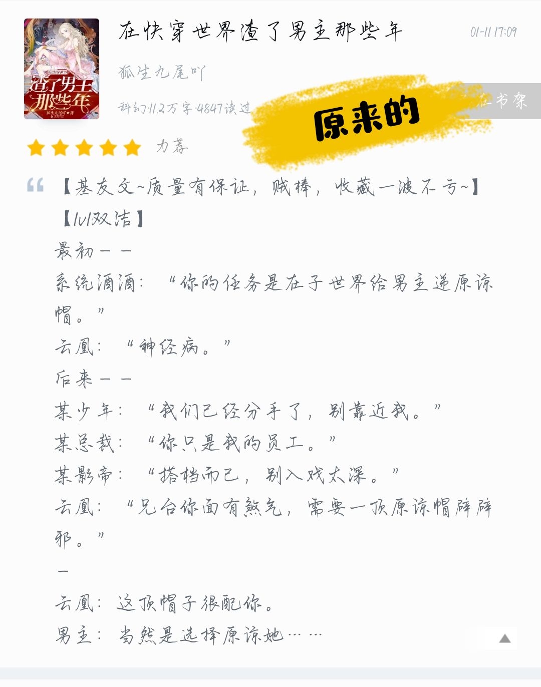 To be honest, I have seen this book recommended several times. When I first saw the introduction, I didn't quite understand how handing over the hat was done, and I tend to be more picky about characters when reading articles. After watching too many stories about women doting on men, I wanted to see men doting on women, so I didn't join in 😂 Later I found out that this was another vest from Jiujiu, and then I started to look at it. Because judging from Jiujiu's old books, Jiujiu should be a female protagonist, so I went into the trap with confidence. The heroine Yunhuang is an extremely rational and strong woman. She will not be moved by the hero Fengxiao risking his life to save her. If she doesn't like it, she just doesn't like it. She will not be affected by any influence and turn her kindness into love. Of course, she is so powerful, even stronger than the male protagonist, because she has given much more than others since she was a child! Moreover, he did not receive the care of his parents, so he was independent and self-reliant since he was a child. I still feel sorry for her at this point. As for the male protagonist Feng Xiao... Yunhuang commented on him like this: "Feng Xiao? Flamboyant, arrogant, arrogant, and arrogant. He relies on his status as a royal family and especially likes to form cliques to bully the weak." "After being beaten down by me, he became a good boy." It can be seen from this that Yunhuang's first impression of Feng Xiao was very bad, and he couldn't beat her! This is interesting. Yunhuang once said that she would not find someone weaker than her as her boyfriend. This laid the foundation for Feng Xiao's long journey to pursue his wife🌝 Personally, I think Feng Xiao is cowardly. He likes Yunhuang, but never takes any action. He waits until Yunhuang is in danger and saves her life while saying "I like you" again. This inevitably makes people think that what he wants to express is: life-saving grace should be promised with one's own body. In fact, his mother did implement this policy. Because he fell into a coma trying to save her, the queen specified that Yunhuang must go to the three thousand planes to collect (strategize) Feng Xiao's consciousness. But in fact, Yunhuang didn't want anyone to save her at that time. It was Fengxiao who came to save her, and now she wants Yunhuang to repay her favor. This means a bit of forced buying and selling. Although I don't know what Feng Xiao's original intention was, the behavior of the mother and son is really a bit despicable. If you don't pursue bold pursuits when you are alive, now that your spiritual consciousness has been scattered, you have to conquer each plane one by one... Fortunately, Yunhuang is bound to Jiujiu, a system with its own S attribute, and is obedient and cute. The most interesting thing is that it doesn't even know that the target of the mission is its idol Feng Xiao, and it keeps encouraging Yunhuang to torture him (ಡωಡ)hiahiahia. He is indeed an idol (object of beating)! In the several planes so far, I have to say that Feng Xiao is really good to Yunhuang, but it doesn't mean that she has to like him because he is good to her. Unlike many fast-traveling stories, Yunhuang and Fengxiao have known each other for a long time, and her impression of him has long been ingrained, and she has no plans to develop from friends to boyfriend. Therefore, it is really difficult to seduce Yunhuang in these small planes. I think, even if Feng Xiao didn't save Yunhuang and she fell into a coma, it might be difficult for him to attack her successfully in the small plane (◔◡◔) I hope Feng Xiao can embrace the beauty as soon as possible!
