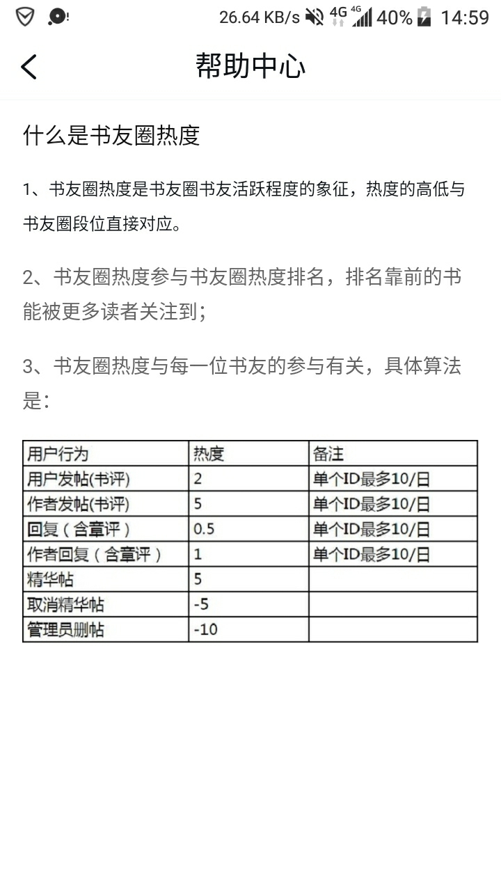 What is book club popularity? 1. The popularity of a book club circle is a symbol of the activity level of book friends in the book club circle. The level of popularity is related to Book club circles correspond directly to the rank. 2. Popularity in book circles. Participate in the popularity rankings in book circles. Books with top rankings can be noticed by more readers; 3. The popularity of the book club is related to the participation of each book friend. The specific algorithm is: user behavior User posts (book reviews) Author posts (book reviews) Replies (including chapter reviews) Author's reply (including chapter comments) highlights Remarks Maximum 10/day for a single ID