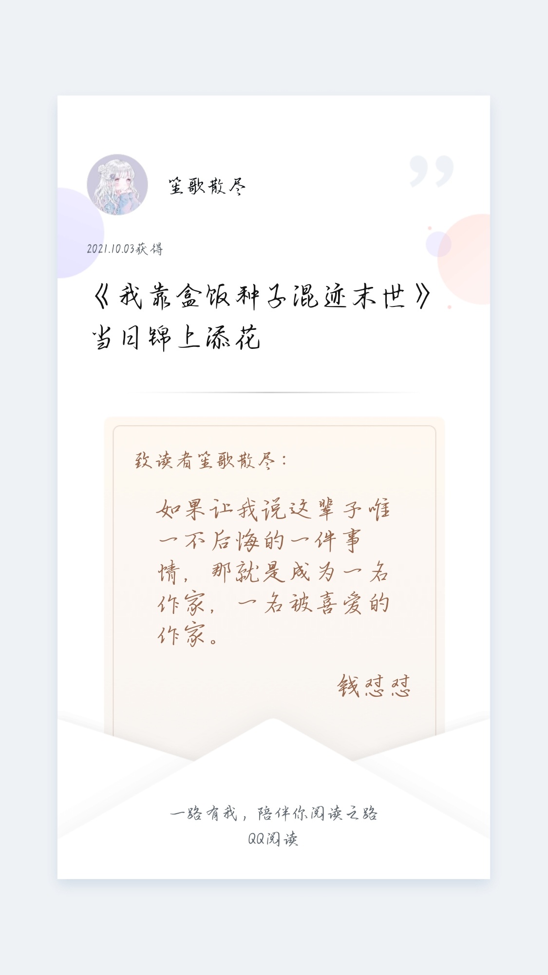 Posting it will make you jealous, wouldn't you envy me? Are you jealous? 嘤嘤嘤~Thank you so much, author! The main reason is that the money is on Alipay and I don't have a bank card, so I can only tip less😊😊. After all, QQ reading can only be topped up with WeChat and QQ.