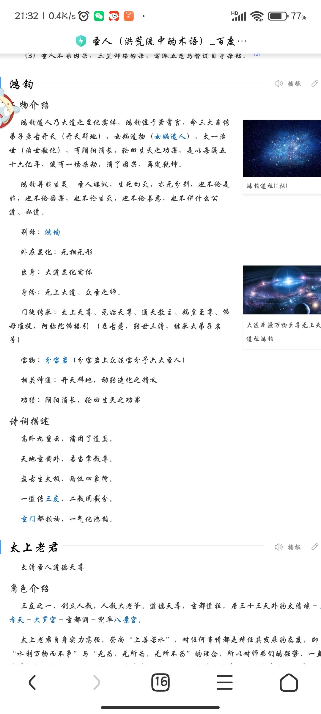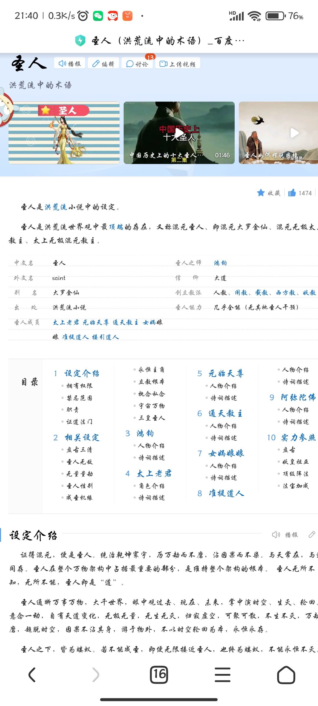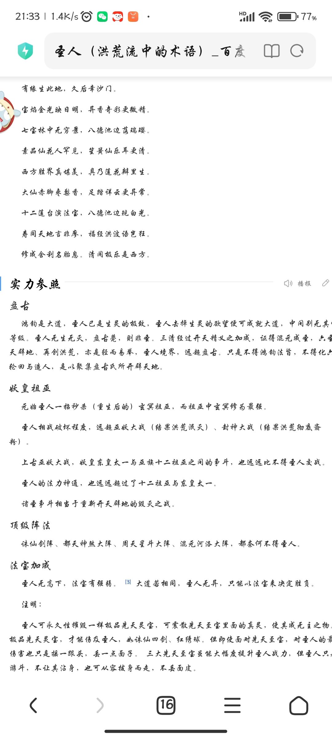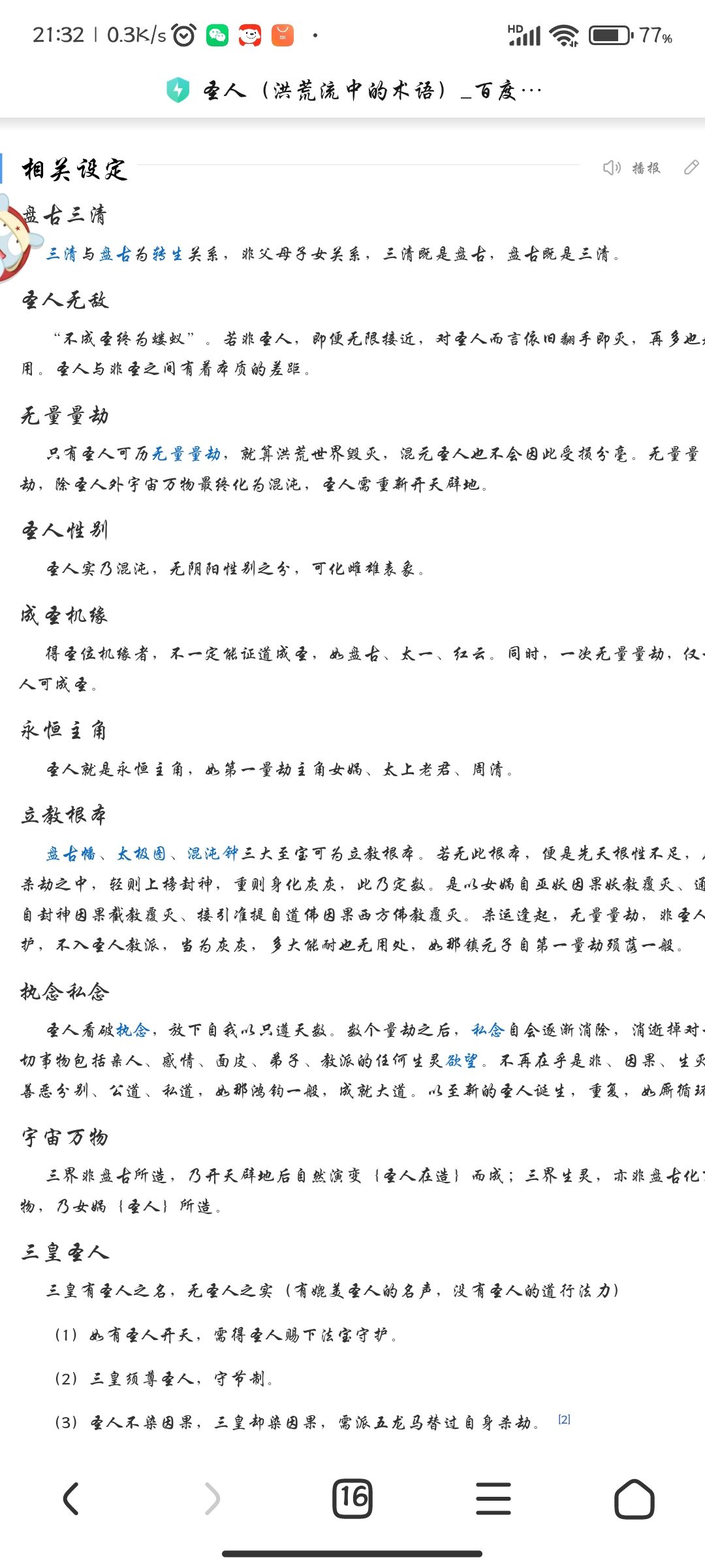 One who attains Hunyuan is a saint. Rule the universe, go through thousands of tribulations without weariness, be stained by cause and effect without being stained. Always with heaven, coexisting with Tao. The saint occupies the most important part in the entire structure of all things and is the foundation for maintaining the entire structure. The sage knows everything and is omnipotent. The sage is the "Tao". The saint has a clear understanding of all things and the vast world. He can see the past, present and future with his eyes, and play time and space, birth and death, and reincarnation in his palms. As soon as the thought moves, there will be changes in the way of heaven. It is infinite and limitless, has no birth and no death, returns to the quiet void, can be gathered and dispersed, neither born nor destroyed, will not be worn out for all eons, transcends time and space, causes and effects do not touch the body, swims outside things, is not based on the reincarnation of time and space, and exists forever. Under the saints, all are ants. If you cannot become a saint, even if you are infinitely close to a saint, you will still be an ant and cannot live forever. For a saint, it can be eliminated without any effort. No matter how much, it is useless. There is no qualitative change caused by quantitative changes between saints and Tao, and there is no question of qualitative change between saints and non-sages. Infinite calamities, for a saint, even if they are the key, are just like a chessboard. No matter how many calamities the universe undergoes, they cannot do anything about it. [1] Have permission A saint can open up the world and create great things again with ease. A saint can use the heavenly energy to perform and refine the top spiritual treasures. If he does not follow it, he will be a lower level (Nuwa patched up the sky and transformed the mountains and rivers into a map of the country; Laozi opened the sky and gave birth to the black and yellow exquisite pagoda of heaven and earth; Yuanshi established interpretation and produced the three precious jade as desired; the sky was cut and cut, the Qingping sword became the Taoist and the seven-treasure tree was played; Amitabha became the Taoist and erected the twelve-level lotus platform). A saint can destroy a non-saint-level meritorious artifact in a single thought, or restore it with his own hands. A saint can instantly break away the inner demons of living beings, even though the inner demons are invisible and formless (so the disciples of the saints do not have to worry about inner demons). Saints can predict all non-holy outcomes during non-catastrophic periods and without interference from other saints. [1] Taboo range A saint does not defy heaven, and he cannot be a saint if he defies heaven (the leader of the Tongtian Church must seek instructions from Hongjun if he wants to destroy the world after signing the list of gods). Saints can create heaven and earth, but without the decree of the Great Dao (Hongjun), there are two things that cannot be done: one is the six paths of reincarnation, and the other is the creation of human beings (or the creation of the protagonist of heaven and earth. The human religion is only the protagonist of heaven and earth for a period of time, but not the eternal protagonist. The world created by the saint is generally the same as the prehistoric world, but you cannot privately build the six paths of reincarnation and the human protagonist in your personal dojo). A saint can resurrect a person who has perished in ashes. He must follow the direction of the sky and cannot go against it. If it goes against heaven, it cannot be done. [1] Responsibilities Open up the wilderness: open up the world (for example, Pangu transformed into the Three Pure Ones and opened up the sky and split the earth) Evolving creatures: creating all things (such as Nuwa creating artificial things) Creation and enlightenment: establishing a sect and educating all living beings (for example, Taiyi established heaven to rule the world and educate [failed], saints established Buddhism and Taoism, and established three emperors) End the great calamity: kill all sentient beings and pass on the fire (for example, after measuring the calamity, the Six Saints will cut down the wilderness again) Opening up the prehistoric world is like re-opening the prehistoric world after measuring calamities; evolving living beings is like recreating all living creatures after their extinction; creating religion and enlightenment is like establishing the laws of heaven and earth to regulate human beings, making the world have rules; ending great calamities is like presiding over great calamities, like Yuanshi presiding over the calamity of conferring gods, so that the fate of murder will not endanger all living beings; when the cause of the three realms When the fruit is entangled and all living things are evil, leading to a calamity of killing, the saint will kill the universe to clear the cause and effect of the world, and retain the fire of the living beings (sheltered in the saint's dojo or the true soul on the list of gods); then he will open up the world, evolve the living beings, create religions and enlightenment, until the next calamity. Like a cycle. The Method of Enlightenment No matter what method is used to attain the beginning of enlightenment, it cannot be achieved without the power of countless kalpas. They are all derived from Hongjun's "the essence of creating the world and transforming creation". Because everyone has different understandings, there are three thousand avenues, and there is only one way. [1] Enlightenment method Demonstrate with force The three corpses of Bu Zhan gathered countless kalpas of magic power and Taoism to become saints. For example, Sanqing understood the essence of opening the sky, Nuwa understood the essence of creation, the Taoist guide understood the essence of lotus, and the Taoist Zhu