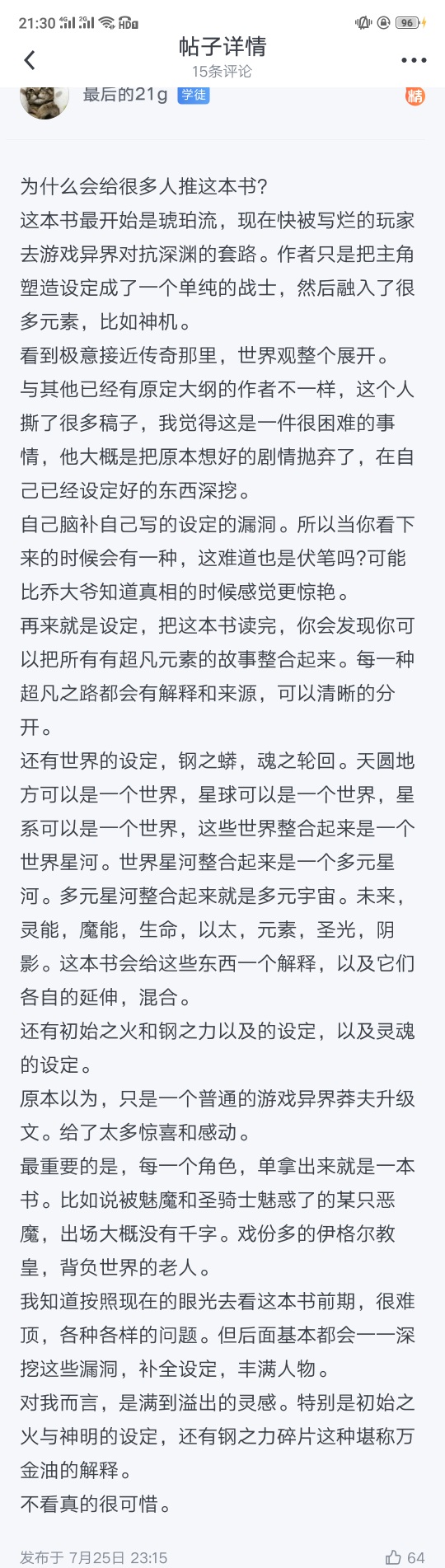 Overall, this book can actually be given five stars. It's just that in the middle of writing, it became more and more sluggish, and then the masterpieces that had no reading points in the early stage seemed to start to leak frequently. Especially the first trip to the abyss in more than 500 chapters, which is the protagonist's first battle after entering the abyss. The plot after such a substantial improvement in strength is particularly critical (maybe the whole book will collapse), and then the author has also laid out dozens of chapters of daily plot (a big chapter, almost 80,000 words), and then after entering the abyss, it is a batch of water, starting to pave the way for the climax (the battle against the devil king), which is tens of thousands of words (a batch of water throughout the whole process). Then I thought I would have a great time, but the result was "You don't understand my power at all", "You've fallen into a trap", "I'm going to go all out". The devil king went back and forth, and the battle lasted for nearly 40,000 words (nine chapters), but in the end he was not dead, but was saved (probably not even his vitality was hurt, he can recover). . . It's hard to understand. There was so much foreshadowing, telling how powerful the Thousand-Eyed King is (only the Pope in the world can fight against the enemy and max attack on defense facilities), and also saying that he must be killed, and then it ended in an anticlimactic manner. Someone came to save him, and the protagonist gave up and ran away. . . In particular, the reason why he didn't kill him was that the hand knife condensed with the power of steel did not break the opponent's core. ? ? ? The power of steel, as the origin of the universe, the source of fighting spirit and life energy, cannot be destroyed with a full blow, so how can this core be protected? Use it as a shield. . . All in all, this book is a masterpiece of brain waves. If you read it correctly, you will feel intoxicated. There are more than 500 chapters, and there is only one poisonous point. To be fair, it is very nice. As for why I gave up, I feel that the rhythm is collapsing and getting worse, and the emergence of poisonous points is also a reason (I believe that a book either has no poisonous points, or has countless poisonous points). If there is a plot like this with dozens of foreshadowings and no results, it will really be disgusting (in fact, it is already disgusting), so for the sake of mood, end it and leave a good impression on this book in my heart. (The plot really collapsed when it collapsed . The previous plot was quite enjoyable, but why inexplicably did this disgusting plot appear in the middle period )