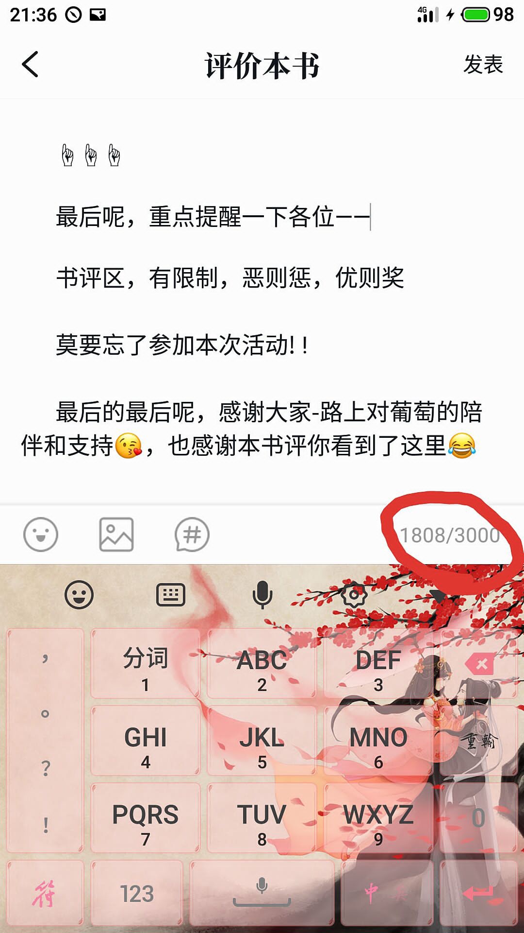 The following comment comes from Xiao Liuer (Liu Yixin), the administrator of Grapevine: [Yue Ge Xia Xia is the second book written by Miss Putao. I stumbled all the way here, and it won't be long before the second book is almost finished. From Putao... No, she should have been called Jiang Yuchuan at that time (isn't this name very A?). From the moment Jiang Yuchuan picked up a pen (computer), many cuties discovered her one after another and stayed with her until today. Grape rarely bubbles, and almost doesn't care about the book review area - but everyone will read the book reviews - so the book review area is still a large wild forest. We don't want this forest to be silent, but we also don't accept any unfriendly or incorrect noises coming from it. So, at this unsuitable time when the book is about to be finished, it's time to draw a clear line in our "The school sweetheart is actually your ex-boyfriend" book review area-- 1. Punishment: 1. Anyone who is too violent, maliciously gives low scores, or personally attacks the author, administrator, or any cute person who reads the article will be warned and deleted. If the dissuasion is ineffective, the author and administrator have the right to ban them for an appropriate period of time; 2. Insist on genuine editions and resist pirated reading!! It is strictly prohibited to promote or seek pirated reading software or pirated reading methods in the comment area, chapter comment area and other pages related to this book. Violators will be warned to have their comments deleted and banned; 3. As readers of QQ, you should always maintain your fairy demeanor. When dealing with readers who make unfriendly remarks in the book review area or chapter review area, please use polite words and tone as much as possible~~ If there are [those who make excessive and inappropriate remarks] (emphasis: excessive and inappropriate), no matter what their views are, they will be reminded, warned, deleted, and banned as usual; 4. It is not allowed to discuss or promote other authors and their works on the relevant pages of this book (except for the author's initiative and positive mention). Violators will be warned to delete their comments, and in serious cases, they will be banned; Readers of this book or fans of Putao are also not allowed to comment (regardless of praise or criticism) on this book and Putao and Putao's other works on pages related to other authors' works. We can't punish this, but I believe that every lovely lady who likes Yue Ge Xia Xia and grapes can do it!! 2. Prize: 1. In order to thank every reader for their tip, the administrator will check the tip area from time to time and refine each tip. (Additional refinement can increase the growth value of the reader's account.) I also hope that qualified little cuties will reward you more and kill the grapes with the sour smell of money!! 2. In order to encourage readers to speak more and be more active, the administrator and Putao himself will search for excellent long reviews in the book review area for a long time (BB, long reviews must be at least 2,34,500 words long, too short to attract us), and encourage excellent long reviews. For some extremely outstanding book reviews, special cases will be placed at the top~~ 3. Let's complain about Putao's laziness under real name. Logically speaking, we should start doing various activities now, but this laziness in the late stage rejected me without any cover-up: "The reader is cold and the author is cold, which is just right." "Mainly I'm lazy." What else can Liu'er, the errand boy, say? I can only regret to tell you, just wait~~ However, in order to bid farewell to Yue Ge Xia Xia's departure, Xiao Liu'er, the administrator + CP fan, of course has to express her gratitude~~ From the time the review of this book is published to the official completion of the article "The school sweetheart is actually your ex-boyfriend", I will pay a small red envelope out of my own pocket to reward selected long review activities: ·[Time limit] The period between the publication of this book review and the official completion of this article · [Number of people limited] Since I don't know how many or even if any little cuties will participate in the event, the limit is temporarily undetermined. If the event is busy, it depends on how far Xiao Liuer's wallet can stretch 😂 · [Conditions] Fans are worth apprenticeship and above A long review of 400 words or more (you can take a screenshot of the word count before publishing the book review, as shown in the picture below) A screenshot of the record of voting for at least three recommendation votes for this book in the past four days, or a screenshot of the record of voting for at least three monthly votes in the past month. The content can be comments or confessions (characters and authors in the book) [How to participate] ·[How to participate] 1. Write a good book review (writing an excellent title attracts me more~~), take a screenshot of the word count before publishing and save it; [It is best to copy the full text before publishing to avoid system deletion] 2. Add your contact information and share the book review with me, along with screenshots of the word count, screenshots of at least three recommendation votes cast in the past four days, or screenshots of three monthly votes cast in the past month, and screenshots of your personal homepage; 3. Wait for the person to contact you and claim the prize promptly after the selection. [One more note - the rewards for this event are in book coins, the amount will not be very large, and the details are temporarily undetermined] ☝☝☝ Finally, I would like to remind everyone-- There are restrictions in the book review area. Evil will be punished and excellence will be rewarded. Don't forget to participate in this event!! Finally, thank you all for your companionship and support to Putao along the way😘, and thank you for reading this book review😂 Xiao Li