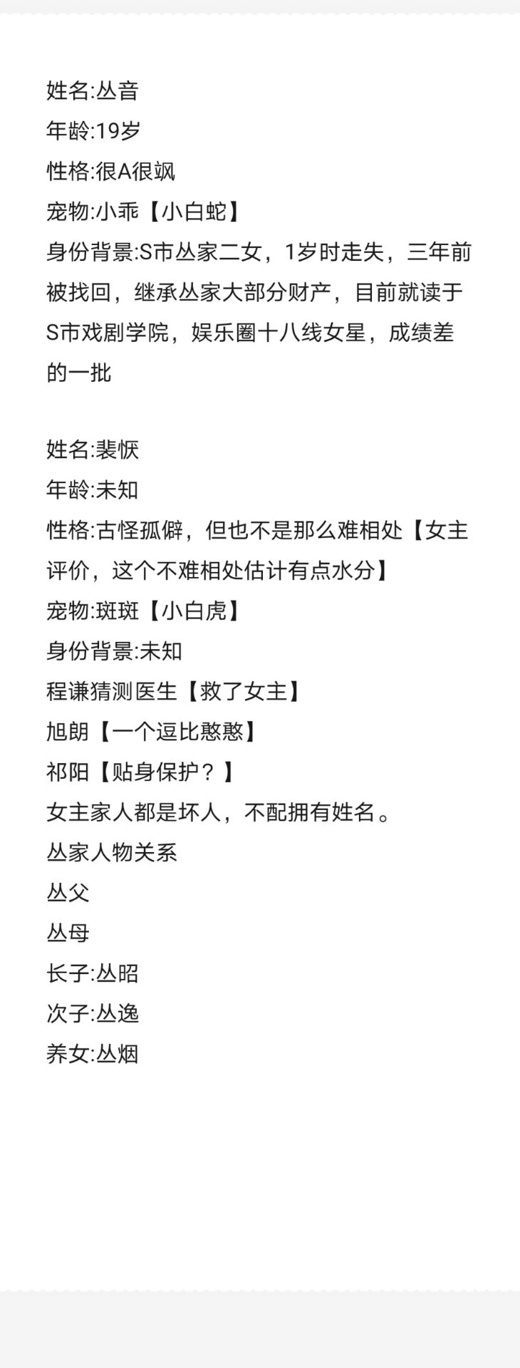 Name: Cong Yin Age: 19 years old Personality: Very A and very sassy Pet: Xiaoguai [Little White Snake] Identity background: The second daughter of the Cong family in S city. She was lost when she was 1 year old. She was found two years ago. She inherited most of the Cong family's property. She is currently studying at the Drama Academy in S city. She is an 18th-tier actress in the entertainment industry and one of the poor performers. Name: Pei Huan Age: unknown Personality: Weird and solitary, but not that difficult to get along with [The heroine commented that this person is not difficult to get along with, I guess it's a bit wet] Pet: Banban [Little White Tiger] Identity background: unknown Cheng Qian guessed that the doctor [saved the heroine] Xu Lang [a funny guy] QiyangPersonal protection?