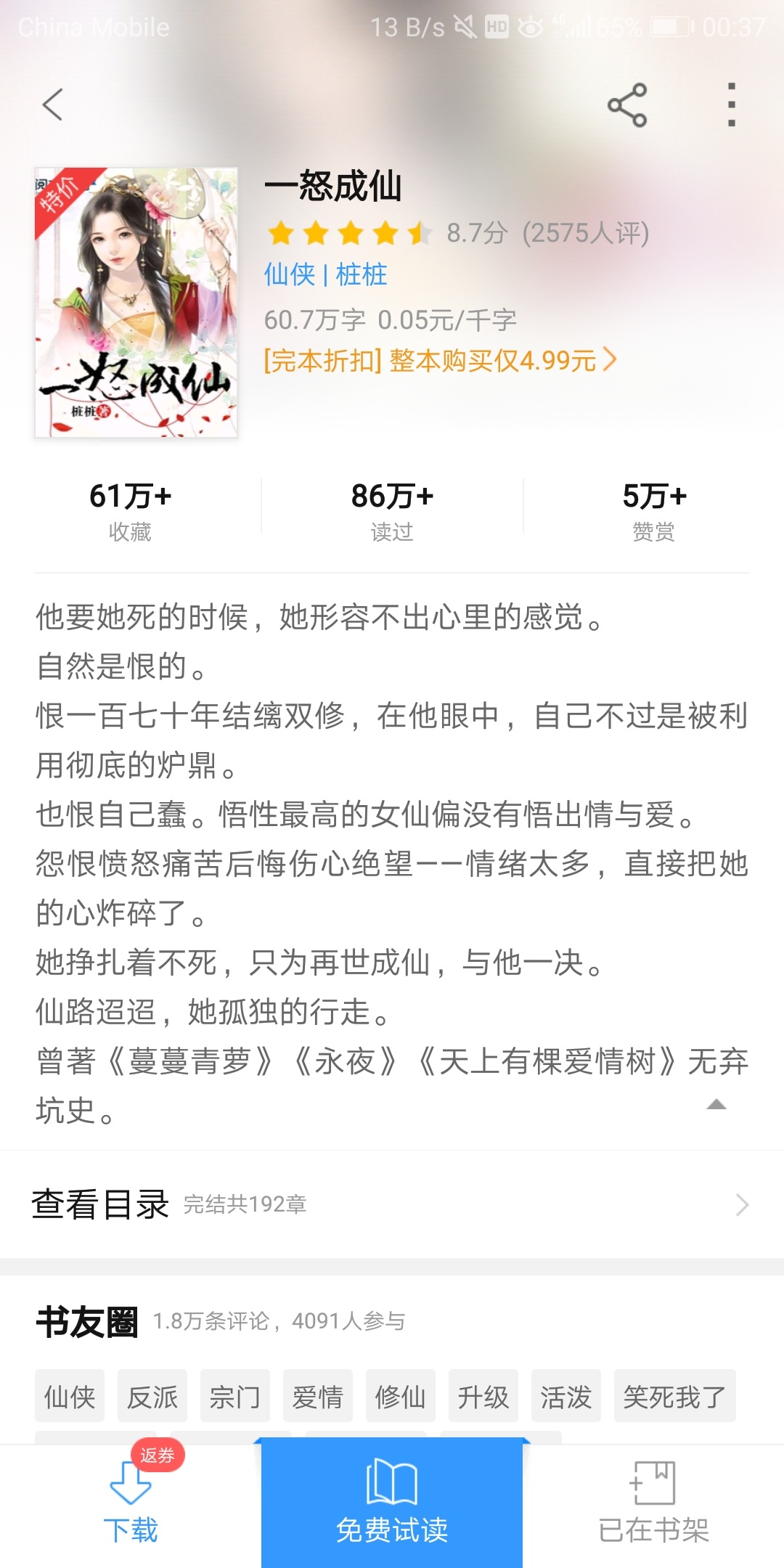 It's 2025 and I can't find any books to read, so I looked for old articles from the past. The book is more than ten years old and I can finish it, which means that this book must be good. The writing style is quite good, not procrastinating or pretentious. There are several sentences that are very rare and make people feel the same. It's just that sometimes the punctuation marks are used strangely, the sentence breaks look uncomfortable, and the reading is not smooth. But the overall plot is excellent, not sloppy, and each small copy is well connected! The imagination is better than the immortality novels in recent years. In recent years, the immortality novels have become less and less interesting. The plots are all the same as those written in a template. You can basically guess the ending after reading the beginning. However, the past and present life of this book are intertwined with the fantasy environment. It is very interesting. It turns out that the ancient novels have more plot! As for the controversial character, to be honest, the heroine's character is not very likable. The heroines in other books are either tough-minded and scheming, enduring humiliation and carrying on a slap-in-the-face style; or they are resolute, courageous, proud, and have a golden finger in the literary style; or they are gentle and cute or lively, like a little white flower and a little sun... But this heroine, well, she is difficult to define. Sometimes she is smart and sometimes unclear, sometimes brave and decisive, sometimes hesitant, sometimes mature and thoughtful, sometimes impulsive and acting without considering the consequences. And she is not a traditional strong woman. Several times the heroine relied on others to get through plot points, and she cried and cried at every turn, making her look so weak... But I cannot criticize an ancient text from the current perspective. Moreover, "character is difficult to define", which is at least better than boring character. After all, it is successful if it can arouse readers' emotions. Several male protagonists and male supporting characters are better portrayed than the female protagonists. The image of the male protagonist is very profound and his character is not broken. He is powerful and loves the heroine. He is a bit tongue-tied but very reliable at critical moments. Rarely recruited. The male supporting characters also have their own characteristics and are quite distinguishable. Especially the character Shi Qingfeng, from a simple, kind-hearted, soft-eared and even "central air-conditioned" young man in the early stage, to one of the villainous bosses who becomes paranoid and sinister in the middle stage. Some people think that his slimy and haunting character is annoying, but I think he is a bit pitiful in his realism. He reminded me of Bishop Claude in "The Hunchback of Notre Dame". One thing they have in common is that they are not simply good or evil, but become very complicated due to experience. In the book, they are representative symbols of human nature. At that time, a young genius who was taught by a famous family had a self-denial, a return to etiquette, and a heart for the right path. Unfortunately, he was unwilling to cause trouble. Fate played a trick on people, and the young man who slayed dragons eventually turned into an evil dragon... Which made people sigh. This kind of lamentation is not about regretting "why he is not the male protagonist." I don't like him either. I was almost angry with him several times. I felt that he was far inferior to the male protagonist. I just simply lamented the life experience and ending of this character. In fact, if he was more open-minded and not so paranoid, he might be able to achieve something with his talent and hard work. Unfortunately, many turning points in life are often due to his inability to look away. The ending felt a little too rushed. I thought the heroine would return to the lower world to resurrect her master, give some guidance to her master, and what happened to the monsters that got her transformation pill? And a lot of people's endings were left unmentioned... A lot of details could have been handled better. The extra chapter is also very satisfying, it just explains the cause and effect of the story, but it would be more interesting if more places that echo the previous chapters are included. In the end, the author stopped writing, what a pity! Alas, writing is not a kind of practice. In the early stage, I had enthusiasm, ambition, talent, and ideas, but time is not forgiving, and inspiration is getting less and less. It is like entering the late stage of Nascent Soul, and I can no longer make progress and produce good works. It's a good book that has both good and bad points, and the flaws don't hide the good points! I also thank the author for creating such a good work