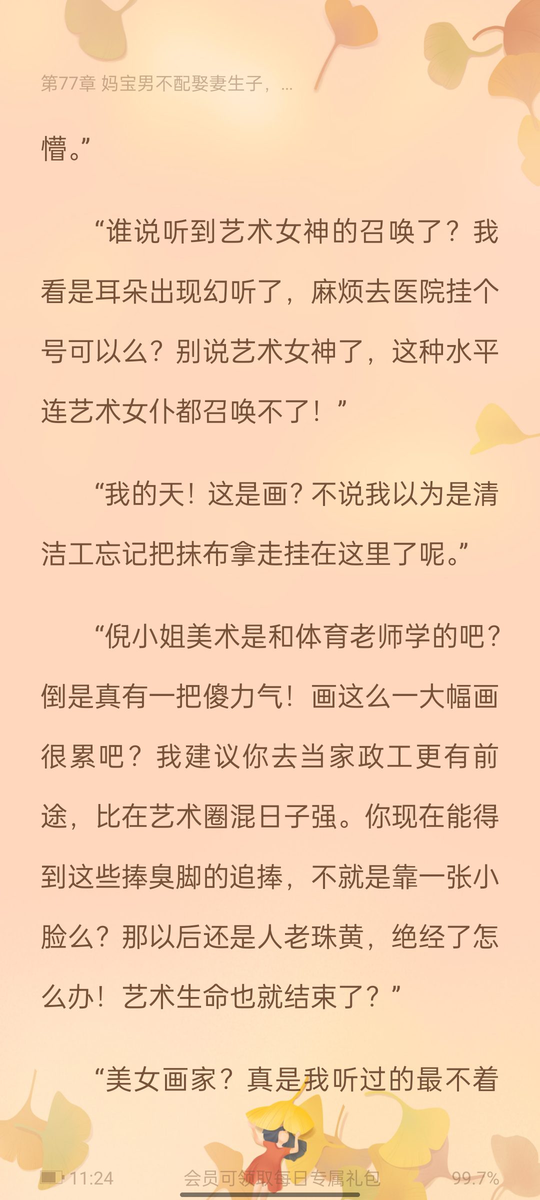 In a story about strong women, the heroine is really super strong, but she always likes to hide it, which makes people unhappy. Characteristics of the heroine: wherever she goes into trouble, she meets scum wherever she goes. The supporting characters are all mentally retarded and nothing but spitting shit. For example, the daughter-in-law who appears to be gentle and sweet but is foul-mouthed and the second female lead; the moral education director who appears to be gentle but secretly molests the students brings evidence of his crime to the bus; and another example is the male protagonist who scolds the uncultivated parents indiscriminately; Then there is the male protagonist, who has no sense of existence. Apart from giving a slight expression when the heroine is talking, he only secretly touches the heroine at night... The screenshot is of the heroine criticizing the painting of the heroine. The background shows the unknown heroine's invincible painting skills after the disguise. The heroine is a female painting student at a well-known university and has won an award... I feel like I still like high-quality, capable female protagonists.