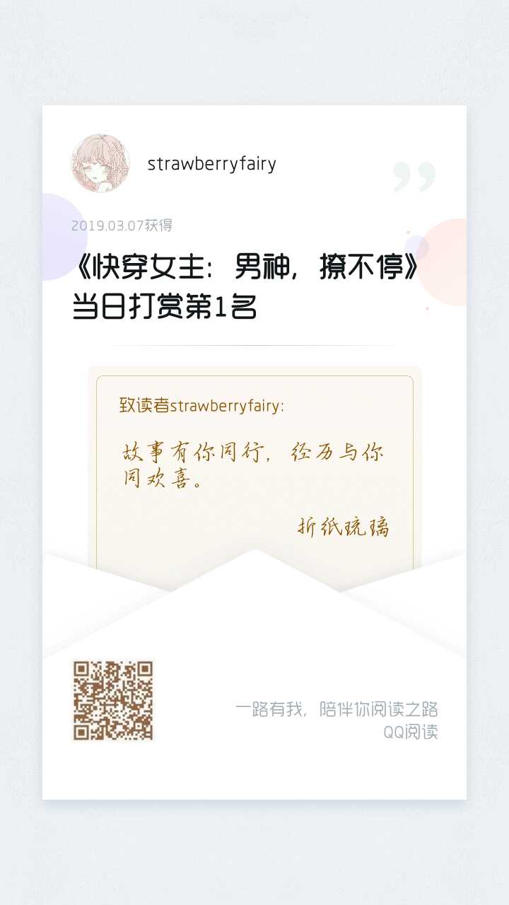 Liuli, I am lucky to meet you in this life. In 2018, I saw the first quick travel book written by Liuli on QQ Reading. It was also the first quick travel book I read. Looking back now, that might be fate! Before I knew it, Liuli's second book had been released. I dedicated my first reward to Liuli. I also hesitated, was it worth it for a book? But I still gave the reward, not for anything else, just to fulfill my dream. (Small goal set for myself: tip 60+ for Liuli's book) I want to be happy in my second year with Liuli! I am actually a person who is not good at expressing myself, but I really enjoyed chatting with Liuli. Although I have never met Liuli, I think Liuli must be a gentle and cute little fairy. Final wishes: Liuli's new book is booming! Allow me three thousand strokes of ink to paint her stunning beauty. This life is uncertain, and eternal life will not be in vain. The magpie bridge on Chinese Valentine's Day brings beautiful faces at dawn and dusk; tenderness is like water, and good times are like dreams. (Note: The writing is not good, so don't comment if you don't like it)