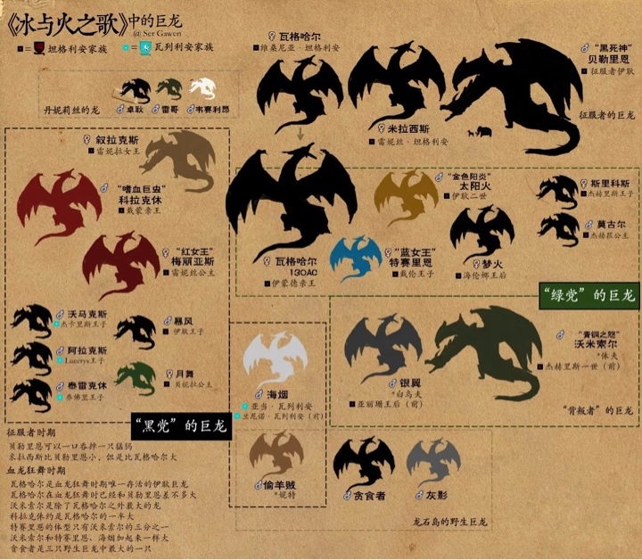 In this prequel to Game of Thrones, Mr. Martin, as the "Tai Shi Gong", details the rise and fall of the legendary family in the main story - the Silver-haired Targaryens. He also spits out every character in the book, including but not limited to using various nicknames. In addition to the entanglements between the major families, what is more conspicuous in the book are the more than 20 fire-breathing dragons that are closely related to the Targaryen family. These dragons are not only the mounts and weapons of the Targaryens, they will also fly in flesh and blood with their masters, fight side by side, confront each other, and perish... Attached is a dragon map made by a netizen. The most graphic thing is that the size of the dragon is proportional to the strength of its owner. For example, the largest of them, "Black Death" Balerion, whose knight is the first generation "Dragon King" Aegon who conquered Westeros and unified the Seven Kingdoms.