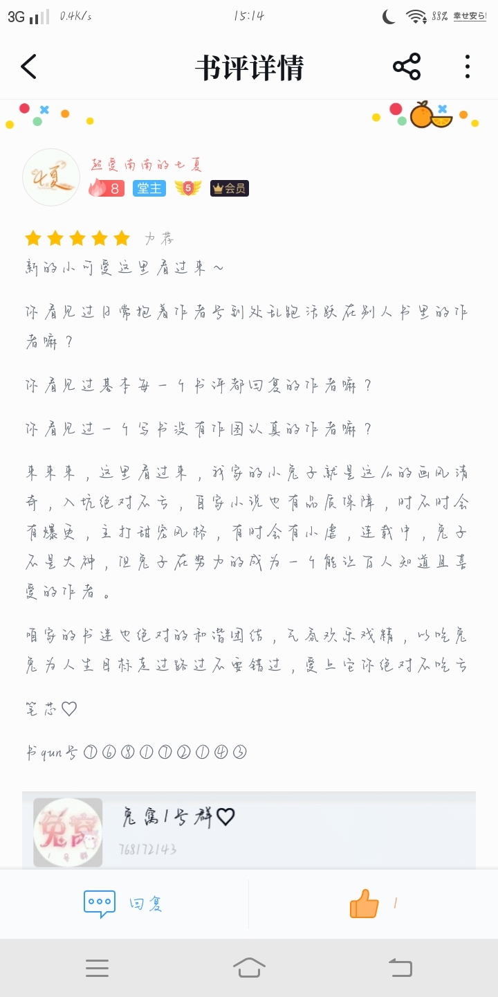 -The first long review of 2020- A year when I still love Bunny. "Do you remember the first time we met?" "Remember." "Is it wonderful?" "Beautiful." The first time I fell in love with Tutu was when I started chatting with a bunch of bunnies about the Tutu menu. Tutu was crazy with us, not aloof at all, very friendly. Then I found out that Tutu was still in school, and I felt that I liked such girls, who were independent and self-reliant. Later, due to my studies and my own emotional problems, I started to stay away from novels for a while, and gradually cooled down in the group. It just happened to be during the vacation recently, and everyone started to have fun together again. Tutu will carefully make avatars for everyone at the beginning, because my first name and circle name are two, Tutu made one for me first, and then gave me another one after knowing about it~ At that time, I felt that this girl was so warm-hearted and gentle. I have been reading Kuai Chuan for a long time. I first paid attention to this book, or Tutu, because she browsed in other book circles and liked it (Misty). I didn't feel much when I saw the news, but when I clicked on it, it was an author account, because author accounts are very rare. , So I got curious (thank you for being curious, which allowed me to meet such a good girl), I saw this book that was just starting out, I clicked on it, read it, and put it on the bookshelf. Then, because Qiqi and some friends called me the same name, I also told my friends about this book. So far, I have met a lot of people in the rabbit nest, including Riyue, Yuezai, Nini, Xiaoyaoyao, Shian, Qiqi, many, many little fairies who often sell themselves. On the New Year's Eve, we wish each other a Happy New Year, discuss various ways to eat rabbits, urge rabbits to update together, play dramas together, open all kinds of inexplicable shops, and refresh pictures like crazy together. Very happy and carefree The second year I like Tutu, the second year I know Tutu In the second year of loving the little fairies, in the second year of getting to know the little fairies, I wish that everything goes well and the future is promising. May all things last forever and time will not be wasted Comes with a bonus rabbit nest entrance~ ⑦⑥⑧①⑦②①④③