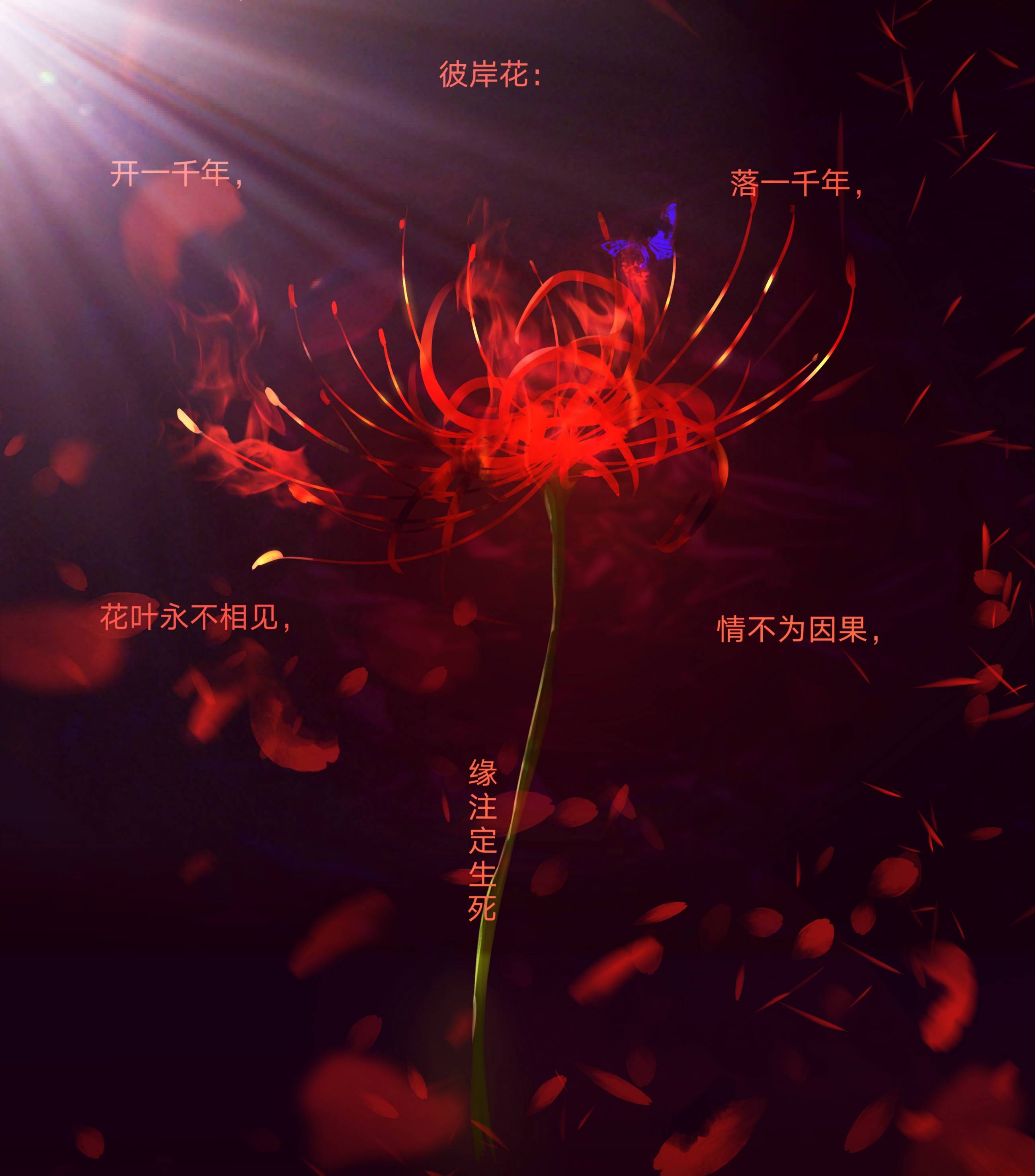 Fairy tales are all lies. Knights will protect princesses, and princesses will only marry princes. Smiling is just an expression and has nothing to do with happiness. Tell lies under your real name in real life, and tell the truth under a false name online. Life is not at the right time, love is not with the right person, everything that happens is fate. What has results is a movie, what ends without a problem is called life. Flower of the Other Shore: The flowers and leaves will never meet each other, love is not cause and effect, destiny is destined to life and death. Epiphyllum: the eternity of a beautiful moment Dandelion: love that can't stay Platycodon: hopeless love Mandala: Unpredictable Death and Love Bluebell: forever waiting