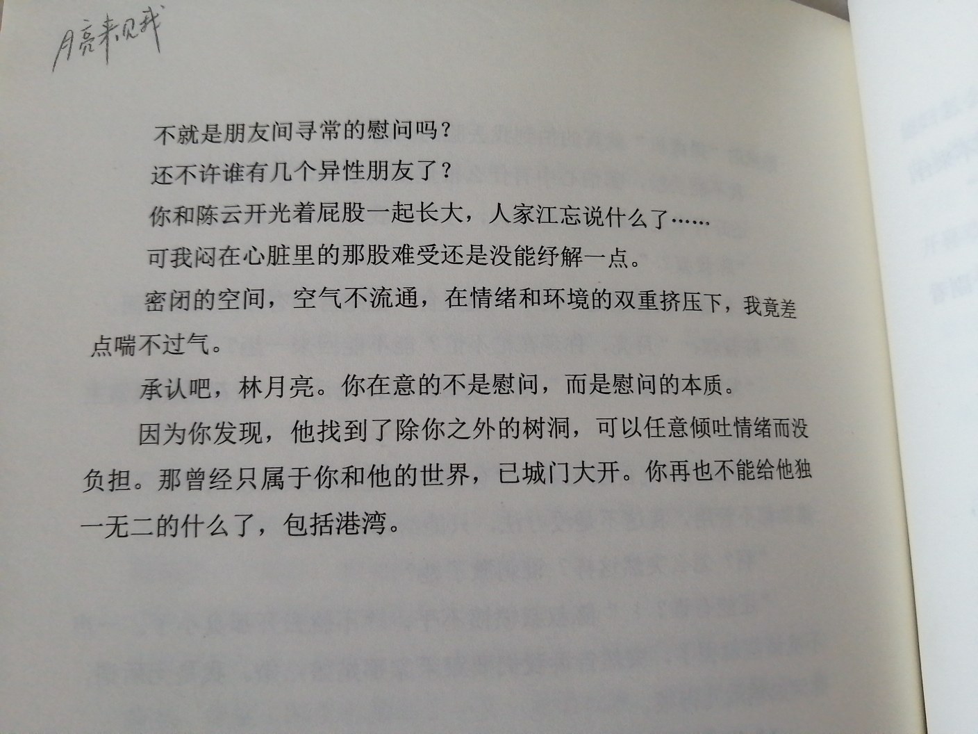 This book is really distressing and heartbreaking. Maybe my experience is very similar to the experience of the male and female protagonists in this book, so I felt even more emotional after reading it. Especially in one section, when Yue Yue knew that Jiang Wang was connected with Chang Wan, Yue Yue's psychology, I can especially understand that feeling, that is, being a How sad it will be when someone who only acts like a child in front of you can do this to others. It feels like a person who only speaks his true feelings to you finds another tree hole. I cried every time I read this novel, probably because I saw myself in this story...