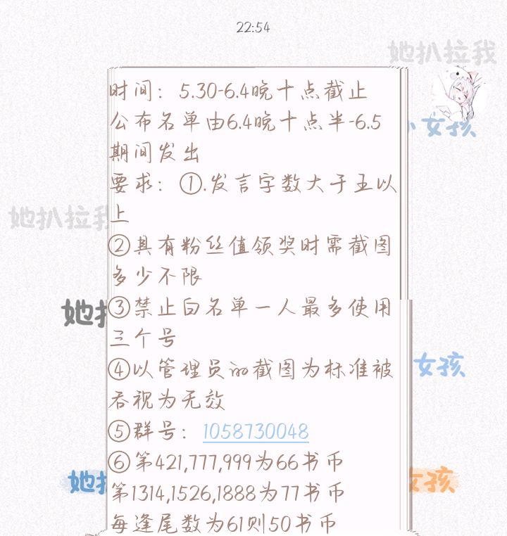 Ⅴ. List kicking: Deadline: 10pm on July 1st Mainly depends on the overall list! ! ! Remember not to make a mistake... List 1: A set of handbooks + makeup mirror + standing sign + color paper List 2: Cosmetic mirror + standing sign + color paper List Three: Standing Card + Colored Paper List 4: Colored Paper + Postcard List 5 to 10: Postcards Draw three people from the eleventh to the seventeenth list: keychains The fan value of kicking the list must reach at least 1,500, otherwise it will be considered invalid. Those above the helmsman level (including the helmsman) can participate in the lottery: 30 RMB, a set of mugs, and a set of physical books Beifeng Knows My Meaning Ⅵ. Idea: Deadline: July 4th From the first chapter to the present chapter, select ten high-quality ideas and receive 3⃣️0⃣️0⃣️book coins. Ⅶ. Familiarity Award: Deadline: July 4th The more active and active you are in speaking up, the more likely you are to be selected, but you still have to rely on a little bit of luck! Ten familiar book friends will receive 3⃣️0⃣️0⃣️book coins ps: Ideas and familiar activities should have fan value, it doesn't matter how much. The total list will not be released until the event is over, so please don't worry if you are the winner of the kick-off event.
