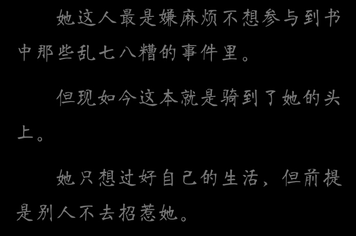 The characters and plot of this book are relatively novel. For example: at the beginning of the book, the heroine's father hurts the heroine because his sister was injured. This is a very common opening, but the difference is in a few points (see the picture). From the three photos, it can be seen that the heroine has a typical character of "not causing trouble and not afraid of trouble". The fourth picture is a plot where Qin Zhou mistakenly thought that the heroine was a self-righteous person. According to normal routine, the heroine usually explained a lot, but Qin Qing was different. He only regarded this as a small episode. It can be seen that Qin Qing is free and easy, does not panic when things happen, and does not care about other people's words. This kind of heroine is quite rare in the popular cross-book novels nowadays, so this is also a point that attracts readers... There are many other places that are different from the common cross-book novels, so I won't give examples one by one. If the analysis is wrong, I apologize here. In short, the characters and plot of this book are not cliche, the articles are very immersive, and the author's writing style is also great. I like it very much!