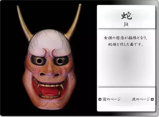 Snake (じゃ) / True snake (しんじゃ), the ultimate form of resentment, is a ghost more terrifying than Prajna. He has no ears, which means "can't hear anything anymore". Noh is mostly based on ghosts and ghosts. In Noh plays, artists use body language to tell stories, "Noh is the life of Noh". It is said to have a history of 600 years. Noh has performances with and without masks, usually only the protagonist can wear them.